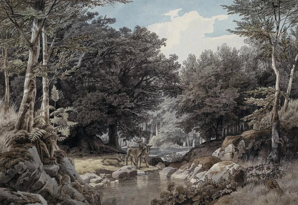 The artwork "Interior of a forest with deer near water" by Johann Wilhelm Schirmer evokes a peaceful and enchanting atmosphere. The composition, rich in detail, immerses us in the heart of a lush forest where light filters through the foliage. The deer, majestic, stand near the water, adding a touch of life to this painting. The colors, ranging from deep greens to warm browns, create a visual harmony that invites contemplation. Schirmer's technique, blending realism and romanticism, allows us to feel the gentle essence of nature, as if we could hear the murmur of the water and the singing of birds.