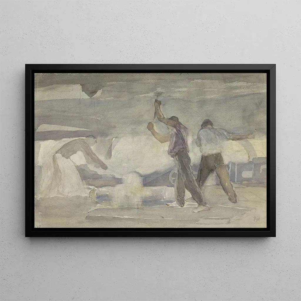 In this art print of Forge, Pieter Josselin de Jong immerses us in a world of relentless work, where light plays with the shadows of the blacksmiths. The warm colors, dominated by shades of red and orange, evoke the heat of the fire and the energy of human effort. The artist's technique, blending realism with impressionist touches, creates a vibrant and dynamic atmosphere, almost tangible. Every detail, from the breath of the forge to the focused faces of the workers, tells a story of passion and dedication, inviting the viewer to feel the intensity of this moment frozen in time.