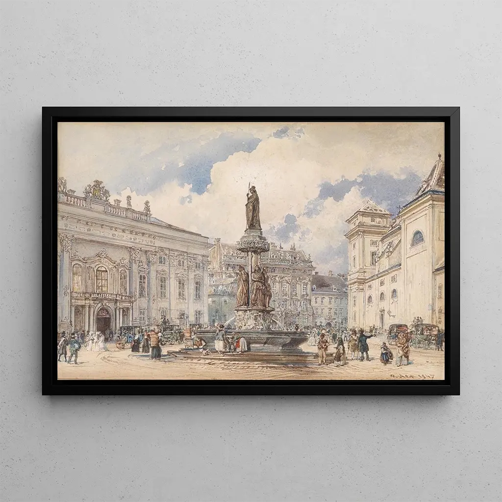 This art print of Freyung with the Austria fountain immerses us in a peaceful universe, where nature and architecture meet harmoniously. The soft colors and meticulous details of the canvas evoke an atmosphere of tranquility, inviting the viewer to pause and contemplate the beauty of the landscape. Light plays a crucial role in this work, subtly illuminating the elements of the scene, while the fountain, at the center, draws the eye and symbolizes life. Rudolf von Alt's technique, with its delicate brushstrokes, creates an impression of movement and fluidity, making each element come alive.