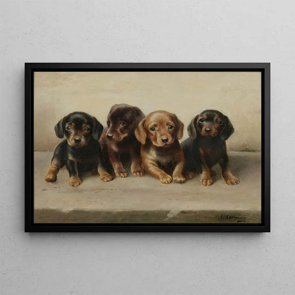 The art print of "Four Dachshund Puppies" is a piece that will appeal to animal lovers and bring a touch of warmth to your interior decor. Whether in a playroom, an office, or a living room, this painting evokes tenderness and conviviality. Its printing quality ensures perfect fidelity to the details of the original work, allowing you to enjoy the full beauty of these puppies. By choosing this canvas, you opt for a decoration that not only enhances your space but also evokes moments of happiness and companionship with your four-legged friends.