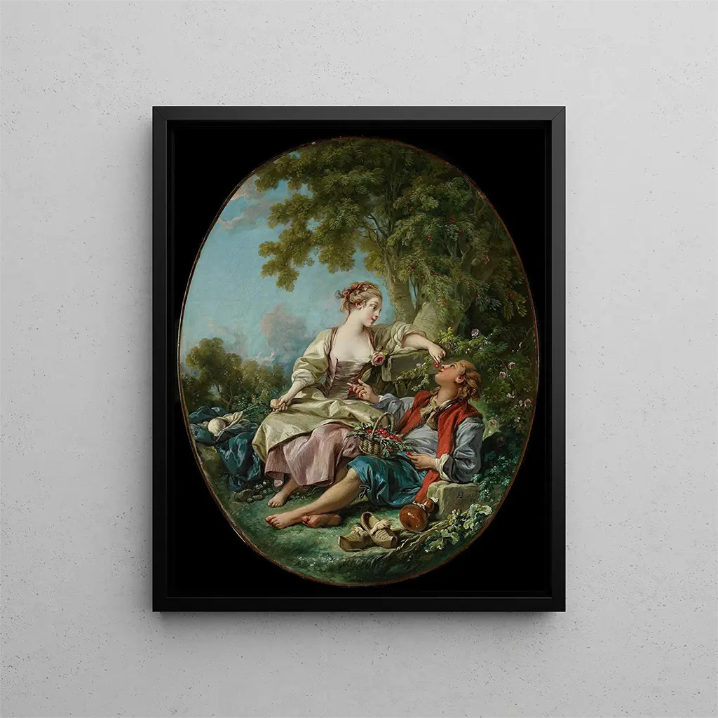 Les Sabots - François Boucher – Captivating Introduction The artwork "Les Sabots" by François Boucher embodies the very essence of rococo art, an artistic movement that emerged in France in the 18th century. This painting, rich in colors and details, transports the viewer into a world filled with lightness and sensuality. Through this piece, Boucher invites us to discover a frozen moment in time, where nature and humanity intertwine harmoniously. The delicate composition and graceful characters evoke a dreamlike atmosphere, creating a subtle dialogue between the visible and the invisible. The art print of this work adds a touch of refinement and culture to any interior, while paying homage to one of the masters of French painting. Style and uniqueness of the work François Boucher's style is distinguished by his bold use of pastel colors and his ability to capture the lightness of forms. In "Les Sabots," the characters are depicted with incredible delicacy, their fluid and natural poses enhancing the sense of movement. The richly detailed background features lush nature that seems almost alive, enveloping the characters in an atmosphere of serenity. Light plays a crucial role in this piece, illuminating the faces and clothing of the protagonists, while creating delicate shadows that add depth to the scene. This attention to detail and mastery of light testify to Boucher's undeniable talent and understanding of human emotions, transforming each gaze into an immersive experience. The artist and his influence François Boucher, born in 1703, is one of the most emblematic artists of 18th-century France. A student of François Le Moyne, he quickly established himself on the artistic scene thanks to his unique style and innovative approach to painting. Boucher was also the official painter of the court of Louis XV, which allowed him to leave an indelible mark on the art of his time. His influence extends far beyond his era, inspiring many artists, including painters of the Impressionist movement who sought to capture light and movement in nature. The way he masterfully combined sensuality