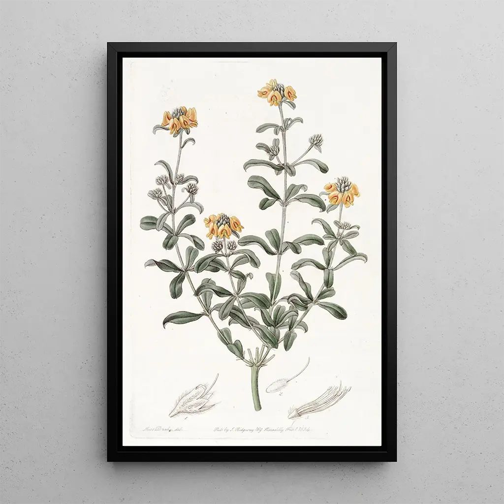 The art print "Gastrolobium with Rounded Leaves" by Sydenham Edwards features a delicate composition where shades of green blend with touches of yellow and red. The leaves, with rounded and blunt edges, extend gracefully, creating an atmosphere of serenity and harmony. The watercolor technique, used with finesse, captures the natural light, bringing to life every detail of this fascinating plant. The piece invites the viewer to attentive contemplation, revealing the hidden beauty of Australian flora.