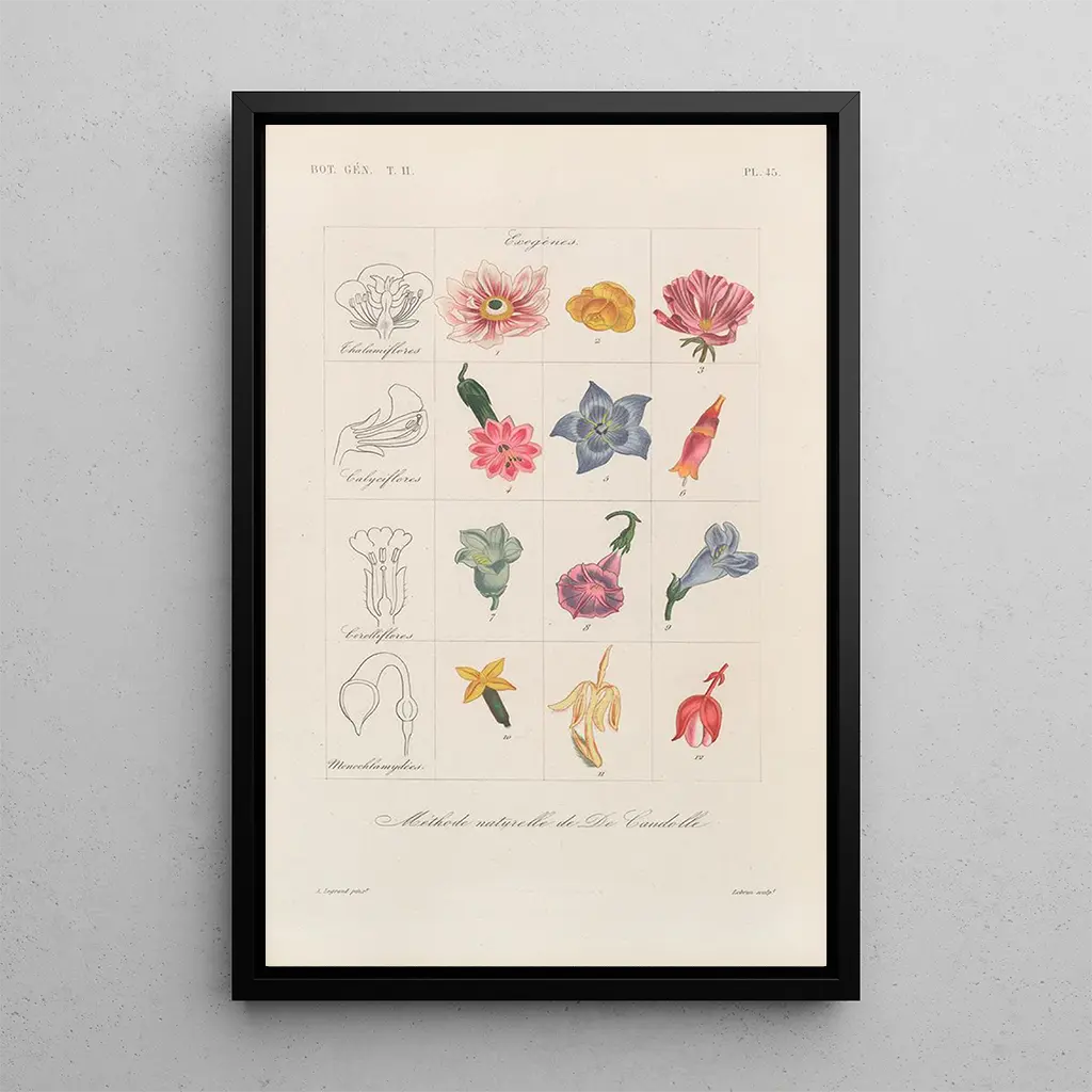 This art print, Traité de botanique générale Pl096, immerses us in a universe where nature is highlighted with remarkable precision. The vibrant colors and intricate details of the illustrated plants create an atmosphere that is both soothing and fascinating. The watercolor technique, masterfully employed, captures the delicacy of the leaves and flowers, bringing each element to life. The piece invites attentive contemplation, where every shade of color tells a story, revealing the beauty and complexity of the plant world.