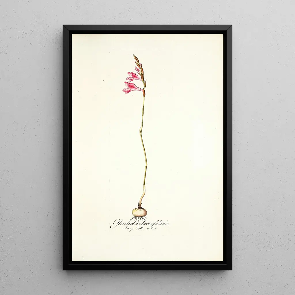 Gladiolus brevifolius : a floral masterpiece to discover The art print Gladiolus brevifolius, by Nikolaus Joseph Freiherr von Jacquin, immerses us in a fascinating botanical universe. This delicate reproduction highlights the unique beauty of the plant, with vibrant colors ranging from pink to green, evoking the freshness of a garden in full bloom. The watercolor technique used by the artist captures the lightness of the petals and the finesse of the details, creating a soothing and contemplative atmosphere. Each brushstroke seems to breathe new life into this flower, inviting us to appreciate nature from a new perspective. Nikolaus Joseph Freiherr von Jacquin: a pioneer of artistic botany Nikolaus Joseph Freiherr von Jacquin, an 18th-century botanist and artist, played a crucial role in the study of exotic plants. Originating from Austria, he traveled around the world, collecting specimens and creating illustrations that marked his era. Influenced by the movement of science and art, Jacquin mastered combining scientific precision with aesthetic appeal in his works. His work contributed to the knowledge of plants and the growth of botany in Europe, making him an emblematic figure of floral art. Gladiolus brevifolius is one of many testimonies to his talent and dedication to nature. A decorative piece with multiple virtues The art print of Gladiolus brevifolius is an ideal decorative item to enhance various spaces such as the living room, office, or bedroom. Its faithful print quality and aesthetic appeal make it a perfect choice for those wishing to bring a touch of nature into their interior. By integrating this art print into your decor, you create a serene and inspiring atmosphere, while celebrating the beauty of flowers. This piece, a true ode to flora, will appeal to art and botany enthusiasts, adding a touch of freshness to your interior decoration.
