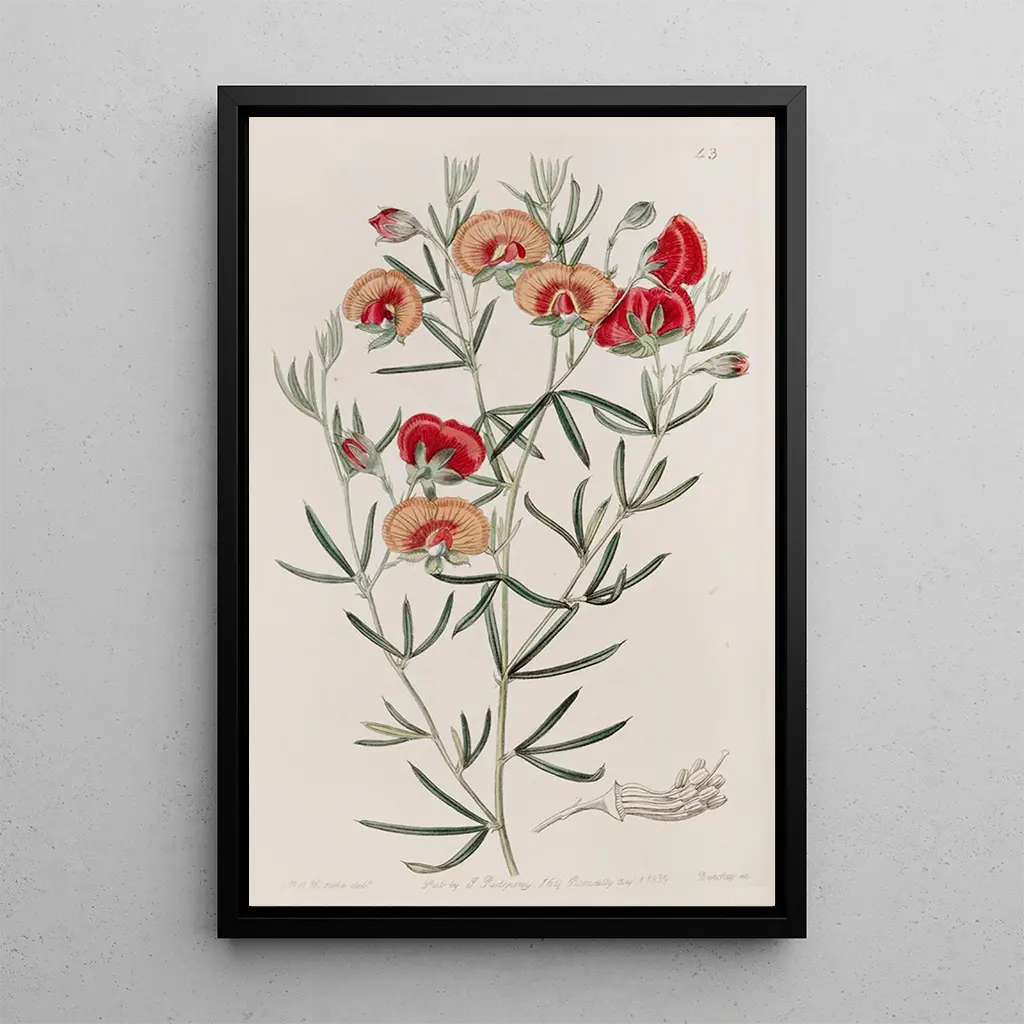 The art print of Gompholobium changeant transports us to a lush garden, where warm shades of orange and red intertwine gracefully. This piece, created with remarkable precision, captures the very essence of this unique plant. The delicate shapes and refined details of the flowers evoke an atmosphere of joy and vitality. Every element of the composition seems to vibrate, inviting the viewer to appreciate the fleeting beauty of nature. The technique used by the artist gives this canvas depth and visual richness that are sure to appeal to art enthusiasts.