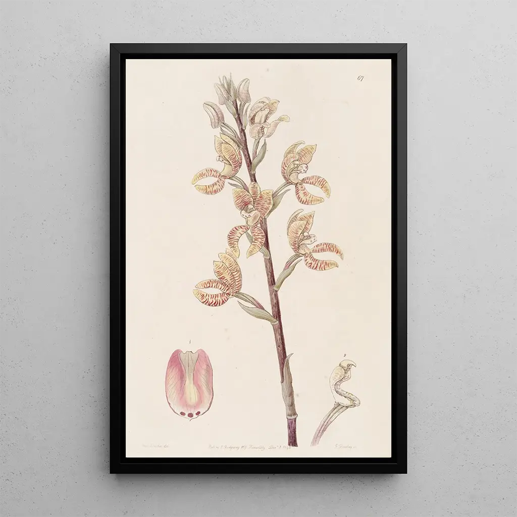 The art print of Govenia de Linden, created by Sydenham Edwards, immerses us in a botanical universe of great delicacy. The pastel colors blend subtly, creating a calming and contemplative atmosphere. The precision of the details, typical of botanical illustrations, highlights each petal and leaf, revealing the intrinsic beauty of this plant. The watercolor technique, used with mastery, gives the work a lightness and transparency that invite wonder. This canvas is much more than a simple representation; it evokes the serenity of lush gardens and the richness of nature.