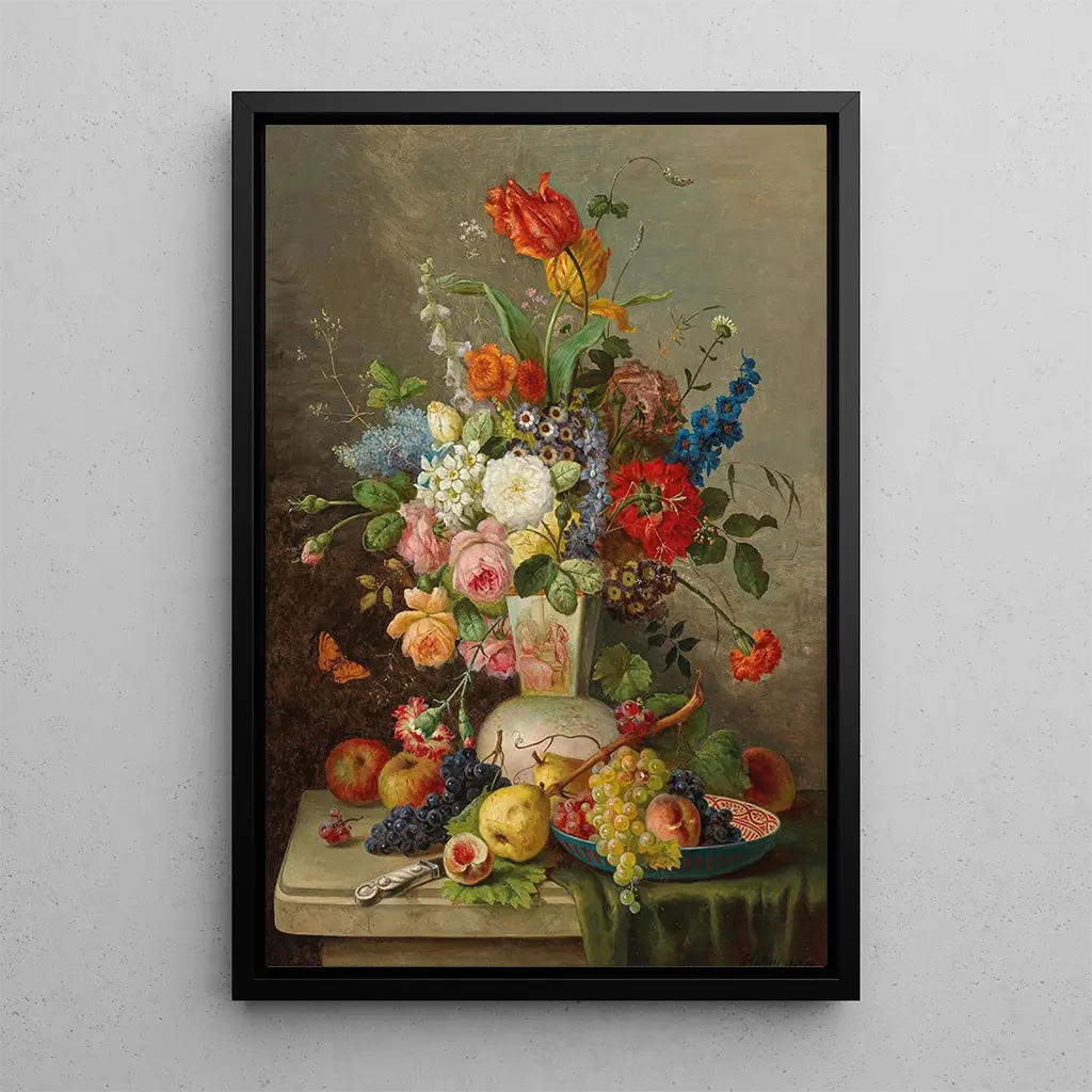 The large bouquet of flowers with fruits on a stone slab by Franz Hohenberger is a vibrant artwork that celebrates the beauty of nature. The bright colors of the flowers, ranging from vivid reds to luminous yellows, harmoniously contrast with the rough texture of the stone slab. Hohenberger employs an oil painting technique that creates a sense of depth and realism, making each petal and fruit almost tangible. This floral composition, rich in detail, evokes a feeling of freshness and vitality, transporting the viewer to a lush garden. Franz Hohenberger: a master of still life Franz Hohenberger, active in the 19th century, is renowned for his still life artworks that capture the fleeting splendor of life. Influenced by Flemish masters, he developed a style that combines precision and sensitivity. His work is distinguished by meticulous attention to detail and a vibrant color palette that breathes new life into classic compositions. The large bouquet of flowers with fruits on a stone slab is a perfect example of his skill in transforming ordinary elements into extraordinary art prints, demonstrating his talent and dedication to natural beauty. A decorative art print with multiple virtues The reproduction of the large bouquet of flowers with fruits on a stone slab by Franz Hohenberger is an ideal choice to enhance any space. Whether in a living room, dining area, or office, this canvas adds a touch of freshness and color. Its reproduction quality, faithful to the details and nuances of the original artwork, allows you to fully enjoy the beauty of nature. By incorporating this art print into your decor, you choose not only an aesthetic piece but also a source of inspiration and serenity that will enrich your daily environment.