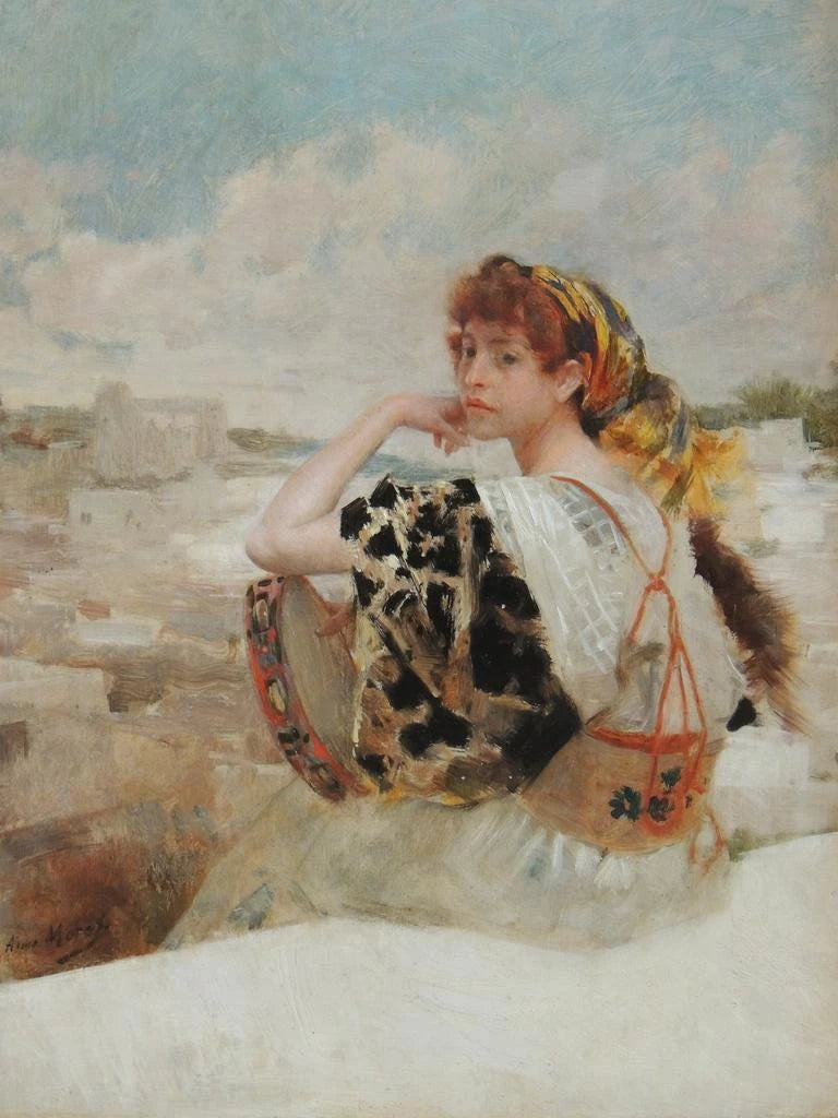 Morot’s style is distinguished by striking realism, combined with a touch of romanticism that gives his subjects rare emotional depth. In "Gitane," the nuances of warm, rich colors intertwine, creating a play of light that accentuates the delicate features of the gypsy’s face. The drapery of her costume, meticulously rendered, seems almost alive, inviting the eye to follow the curves and movements of the figure. The composition, both balanced and dynamic, immediately draws attention to the center of the piece, where the intensity of the woman’s gaze captivates and challenges. Morot uses light to highlight the beauty of details, from the reflections of jewelry to the textures of fabrics, making each element a testament to his technical skill and aesthetic sensibility.