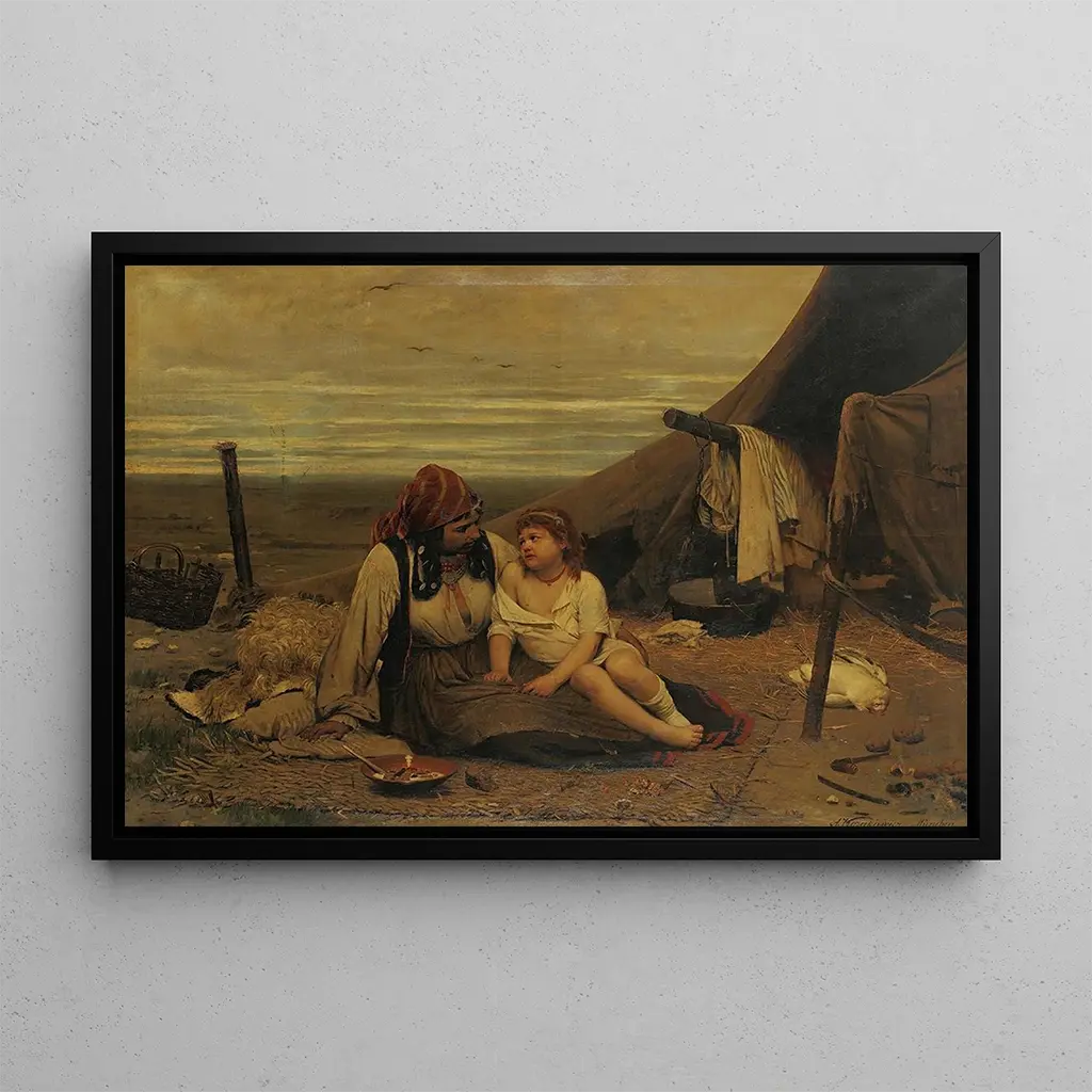 The art print of "A Gypsy Family" is a decorative piece that will enhance your interior, whether in a living room, office, or bedroom. Its printing quality guarantees fidelity to the colors and details of the original work, allowing you to enjoy its aesthetic appeal daily. This painting, with its dynamic and warm representation, adds a touch of exoticism and humanity to your decor. By choosing this canvas, you opt for a piece that not only beautifies your space but also sparks conversations about art and culture.