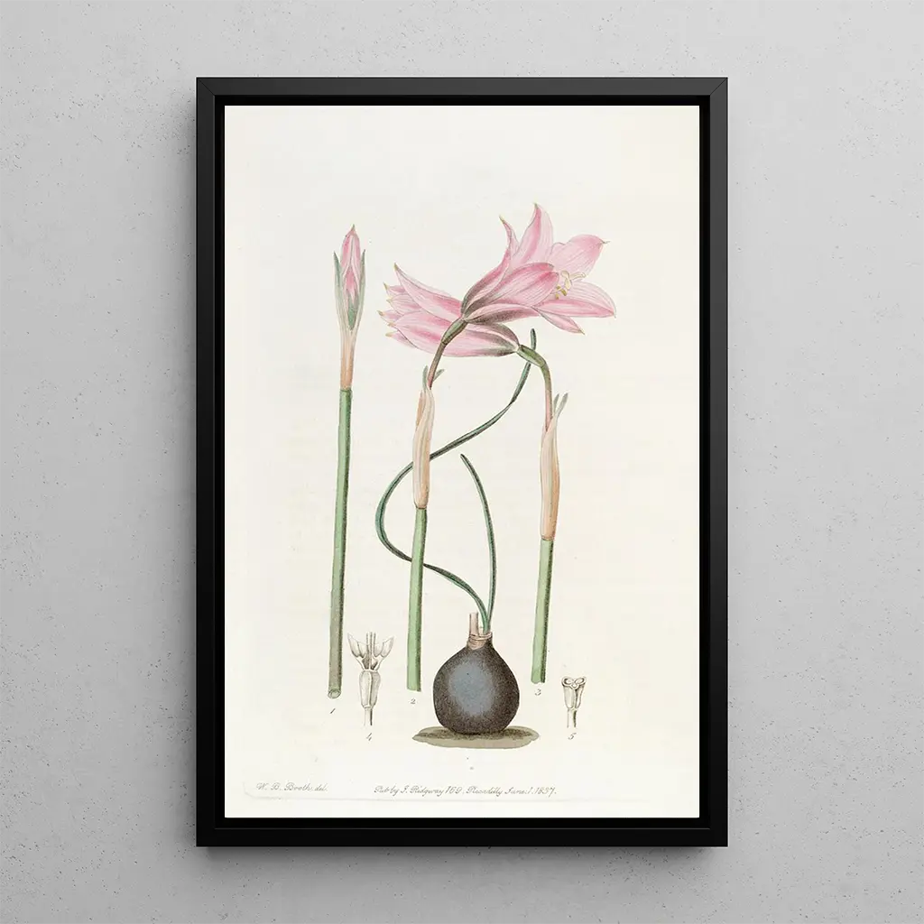 Habranthus with Fine Leaves by M. Booth: a delicate floral bloom The art print "Habranthus with Fine Leaves" by M. Booth is a tribute to natural beauty. The vibrant colors and delicate shades of the petals evoke a springtime freshness, while the harmonious composition draws the eye toward the heart of the flower. The watercolor technique, used with finesse, captures the transparency of the leaves and the luminosity of the colors, creating an atmosphere that is both soothing and inspiring. Every detail, from the veins of the leaves to the light reflections, reflects meticulous observation and a passion for botany. Sydenham Edwards: a pioneer of botanical illustration Sydenham Edwards, active in the early 19th century, is recognized as one of the great botanical illustrators of his time. Influenced by the scientific discoveries of his era, he mastered combining scientific rigor with artistic sensitivity. His works, including "Habranthus with Fine Leaves," are the result of a quest to represent flora with unparalleled accuracy. Edwards contributed to the dissemination of botanical knowledge through his illustrations, becoming an emblematic figure of the Romantic movement in art. His legacy endures, inspiring many artists and botanists across generations. A decorative acquisition with multiple benefits The art print of "Habranthus with Fine Leaves" is an ideal decorative piece to enhance your interior, whether in a living room, office, or bedroom. Its printing quality guarantees remarkable fidelity to the colors and details of the original artwork, making this canvas a true aesthetic asset. By adding this piece to your decor, you bring a touch of nature and serenity to your space, while celebrating the talent of an artist who captured the very essence of floral beauty.