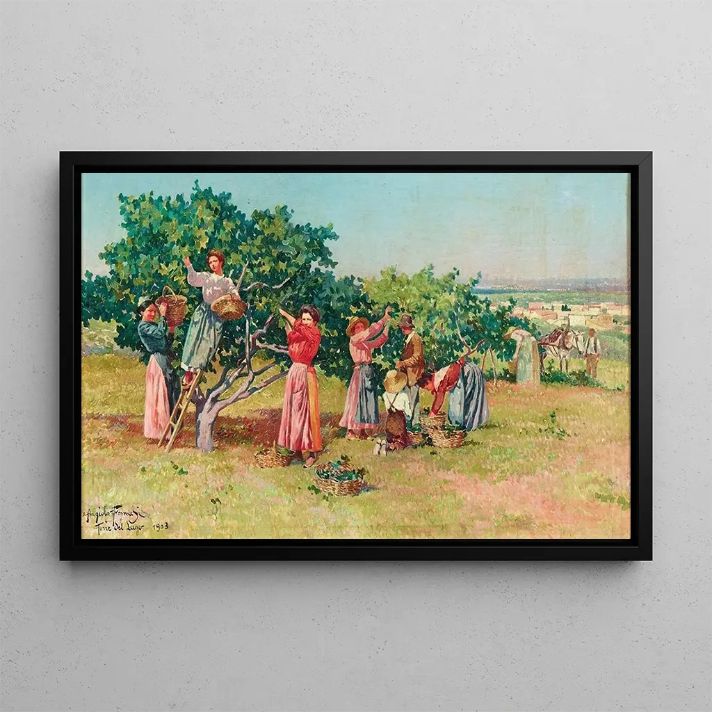 "Tuscany Harvest" is a vibrant art print by Angiolo Tommasi that celebrates the beauty of Italian agricultural landscapes. The canvas depicts farmers at work, surrounded by golden fields and lush hills, under a bright sky. The warm, earthy colors, combined with an impressionist technique, create a lively and dynamic atmosphere. Tommasi captures the essence of rural life, evoking a sense of gratitude towards the land and its harvests. This art print is an invitation to appreciate human labor and the richness of Tuscan scenery.