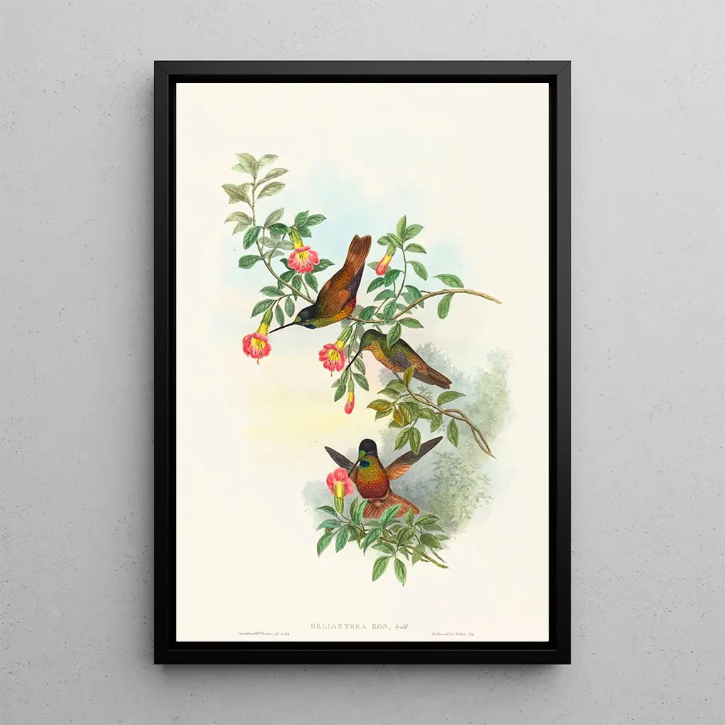 The reproduction of the art print Helianthea eos is a decorative piece that will enhance any interior, whether in a living room, office, or bedroom. Its printing quality guarantees color fidelity and detail, allowing you to fully enjoy the beauty of the original artwork. With its undeniable aesthetic appeal, this canvas adds a touch of freshness and exoticism to your decor. By choosing this art print, you opt for a piece that not only beautifies your space but also evokes the richness of biodiversity and the artistic heritage of John Gould.