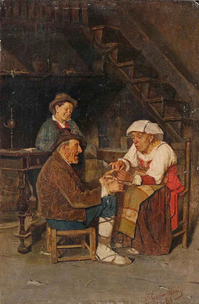 Giuseppe Costantini, active in the 19th century, is known for his depictions of scenes from daily life, highlighting often overlooked trades. His work "Help for the lacemaker" perfectly illustrates his commitment to immortalizing moments of ordinary life with particular sensitivity. Influenced by the realist movement, Costantini captured the beauty of simple gestures and artisanal traditions. His work is a valuable testimony of his era, offering insight into the values and practices that shaped Italian society.