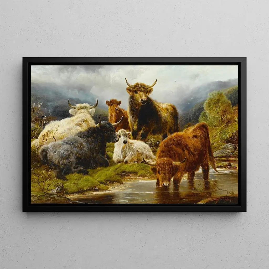Highland Cattle: An Ode to the Wilderness In "Highland Cattle," Robert Watson transports us to the heart of Scottish landscapes. This artwork, rich in detail, depicts majestic cattle roaming in a breathtaking natural environment. Earth tones dominate, evoking the robustness of the animals and the beauty of the lush hills. The artist's technique, blending realism and impressionism, gives the scene a lively and authentic atmosphere. The play of light and shadow adds striking depth, making the cool Highland breeze almost tangible. Each brushstroke seems to tell a story, that of rural life in harmony with nature. Robert Watson: A Witness to Scottish Rural Life Robert Watson, active in the late 19th century, is renowned for his depictions of rural life and Scottish landscapes. Influenced by the realism art movement, he seeks to capture the raw beauty of nature and the simplicity of peasant life. His works, often tinged with nostalgia, testify to a time when the relationship between man and his environment was essential. Watson, through his paintings, invites us to rediscover the splendor of Scottish landscapes and to appreciate the richness of local wildlife. His artistic legacy endures, inspiring many contemporary artists to explore themes of nature and rurality. A decorative piece with multiple virtues The art print "Highland Cattle" is a decorative piece that will enhance your interior, whether in a living room, office, or bedroom. Its printing quality guarantees remarkable fidelity to the details of the original artwork, allowing you to enjoy the peaceful atmosphere it exudes. This piece adds a touch of authenticity and warmth to your decor, while evoking the beauty of Scottish landscapes. By choosing this canvas, you opt for a decorative element that will attract the eye and spark conversations about art and nature.