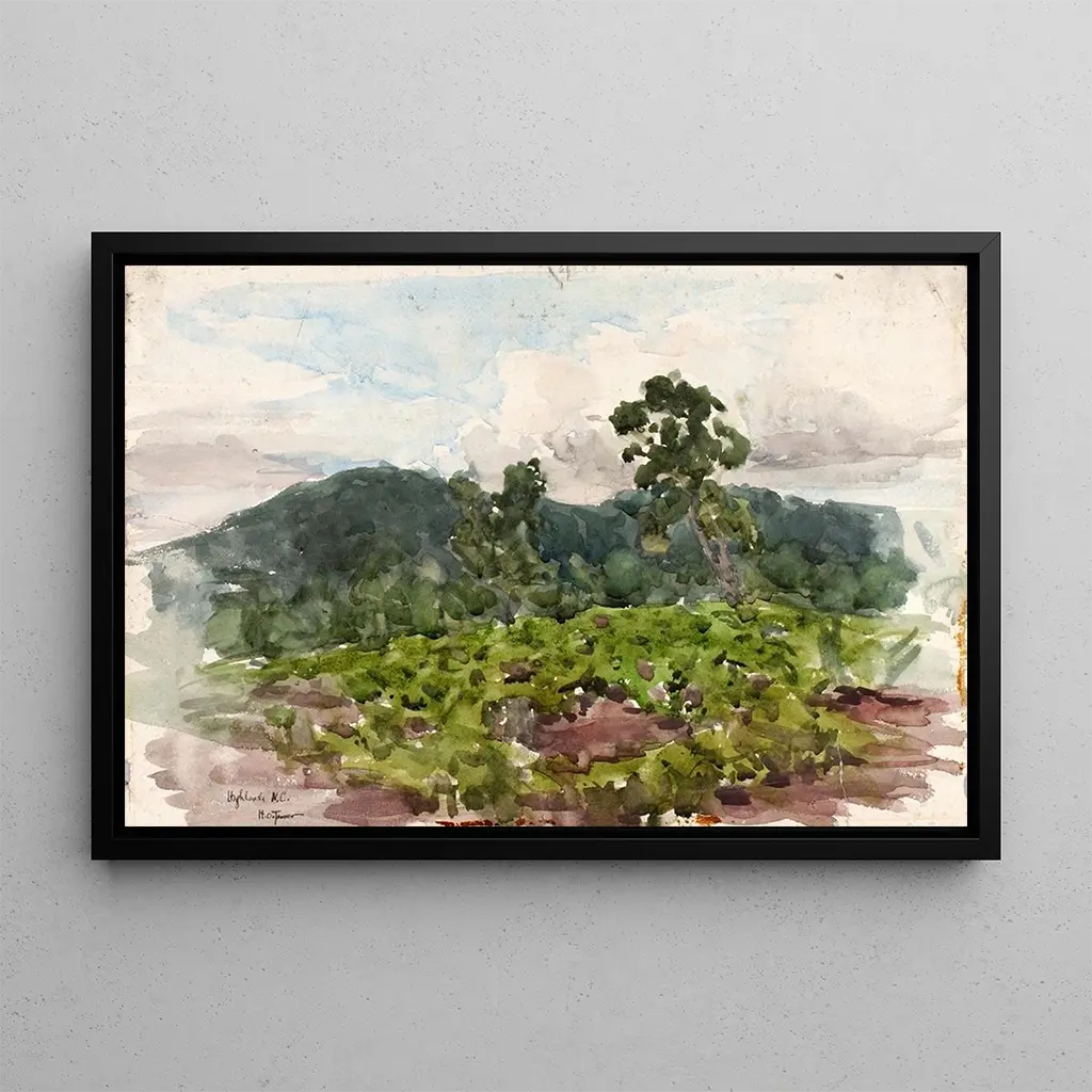 The art print "Highlands, North Carolina" by Henry Ossawa Tanner captures the essence of a majestic landscape, where mountains stand proudly beneath a changing sky. The shades of green and blue blend harmoniously, evoking an atmosphere of serenity and contemplation. Tanner's technique, which skillfully combines light and shadow, brings this scene to life, inviting the viewer to immerse themselves in the natural beauty of the Appalachians. Every brushstroke seems to tell a story, that of a nature both powerful and soothing, where man finds his place as an awe-inspired observer.