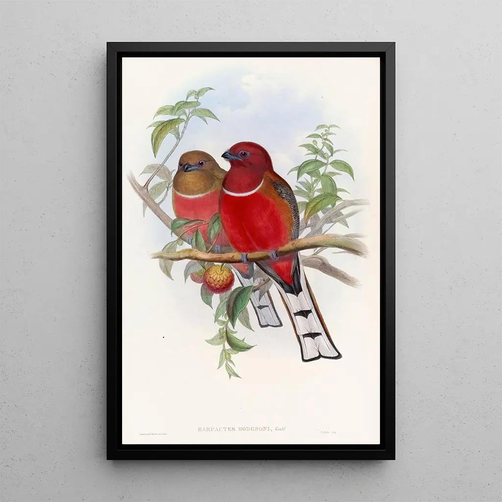 The art print of the Trogon de Hodgson is a decorative piece that will enhance your interior, whether in a living room, office, or bedroom. Its print quality ensures color fidelity and detail, allowing full appreciation of the splendor of the original artwork. With its aesthetic appeal, this canvas adds a touch of exoticism and sophistication to your decor. By choosing this art print, you are not only selecting a piece of art but also celebrating nature and the unmatched talent of John Gould.
