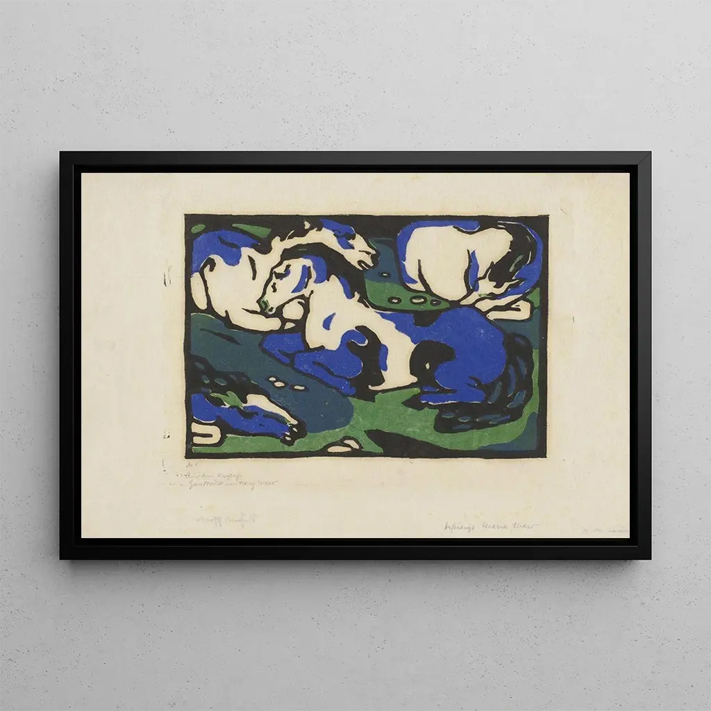 Franz Marc, a major figure of the early 20th century, is one of the founders of the expressionist movement in Germany. Influenced by Fauvism and the spiritual philosophies of his time, he develops a unique style that emphasizes color and form to express deep emotions. His passion for animals, which he considers symbols of purity, is reflected in his works. "Chevaux au Repos" is a testament to his commitment to representing nature and animals, while also revealing his desire to transcend reality through art.