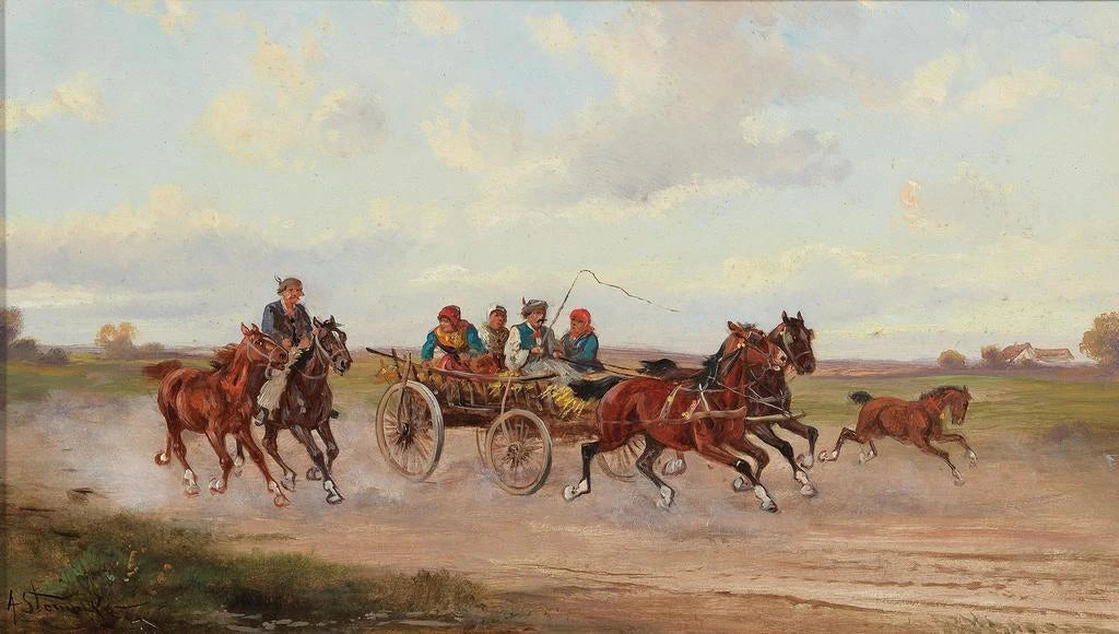 The painting "Hungarian Market Cart" by Alfred Steinacker depicts a lively scene where rural life flourishes under a bright sky. The vivid colors, ranging from bright reds to lush greens, create a joyful and dynamic atmosphere. Steinacker's technique, characterized by expressive brushstrokes, brings the characters and objects to life, making the bustling market almost palpable. Every detail, from the cart loaded with fresh produce to the smiling faces of the vendors, invites the viewer to immerse themselves in this authentic representation of Hungarian culture.