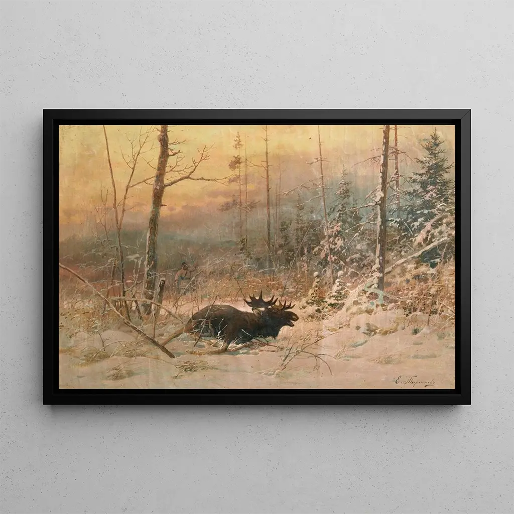 Elk Hunt: A Wild Dance in Nature The art print Elk Hunt by Evgeni Alexandrovich Tikhmenev depicts a vibrant scene where the majesty of wildlife blends with the beauty of Nordic landscapes. The earthy colors and shades of green create a dynamic atmosphere, while the artist's technique, combining realism and impressionism, captures the energy of the moment. The elks, iconic figures of the wild, seem to gracefully charge forward, while the wooded background adds depth to this composition. This piece invites the viewer to immerse themselves in a world where harmony between man and nature is palpable. Evgeni Alexandrovich Tikhmenev: a master of Russian landscape art Evgeni Alexandrovich Tikhmenev, active in the 19th century, is renowned for his depictions of Russian fauna and flora. Influenced by the realist movement, he was able to capture the essence of nature with remarkable precision. His works, often inspired by his travels across Russia, reflect a deep admiration for natural landscapes. Tikhmenev established himself as a major artist of his time, contributing to the emergence of ecological sensitivity in art. His ability to portray wildlife with such vividness makes him a key figure in the history of Russian art. A decorative piece with multiple virtues The art print Elk Hunt is a decorative piece that will enhance any space, whether a living room, office, or bedroom. Its print quality and fidelity to the original colors make it an ideal choice for those wishing to bring a touch of nature into their interior. With its aesthetic appeal, this painting invites contemplation and escapism, creating a warm and welcoming atmosphere. By incorporating this canvas into your decor, you give your space an artistic dimension and a connection to the wild beauty of nature.