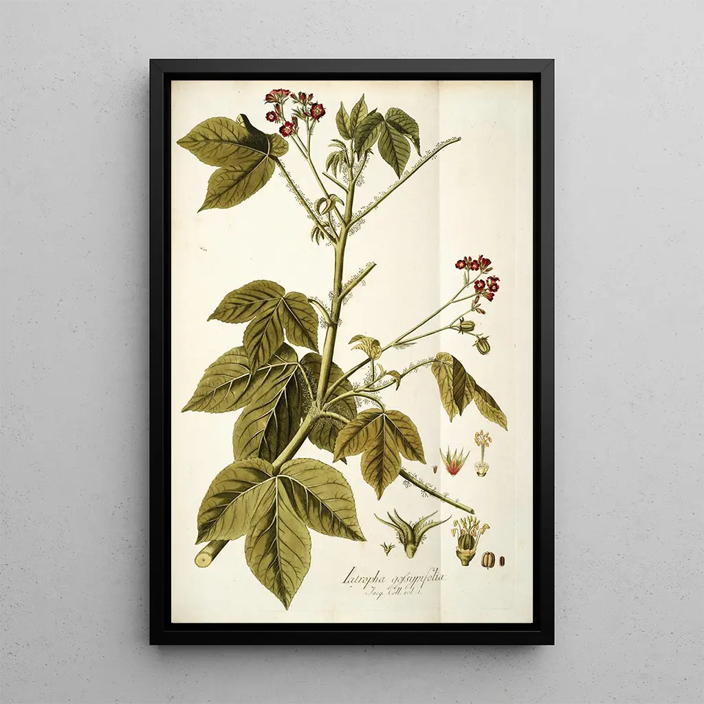 The reproduction of "Iatropha gossypifolia" is a decorative piece that fits perfectly into various spaces, whether a living room, an office, or a bedroom. Its printing quality guarantees fidelity to the original details, allowing appreciation of each nuance and stroke. In addition to its aesthetic appeal, this canvas brings a touch of nature to your interior, fostering a serene and inspiring atmosphere. Choosing this artwork means selecting a decorative element that enriches your space while celebrating the beauty of botany.