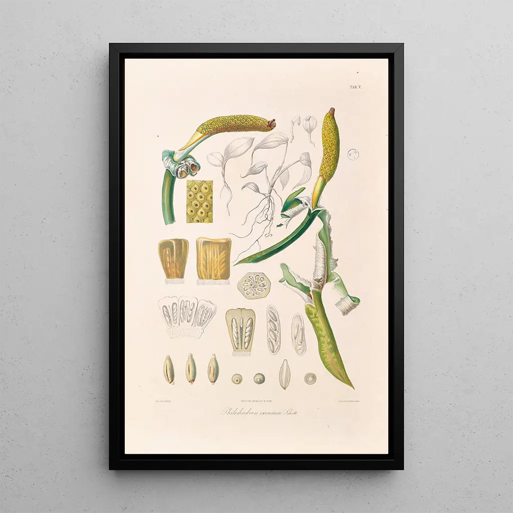 The art print Icones Aroidearum Pl05 is a celebration of the richness and diversity of aroid plants. This captivating piece features a variety of shapes and colors, where every detail is carefully highlighted. The vibrant hues and delicate shades of the leaves and flowers create an atmosphere of harmony and vitality. The engraving technique used by Schott offers visual depth that draws the eye and invites a meticulous exploration of each element. This canvas is much more than a simple botanical illustration; it is a true ode to the beauty of nature.