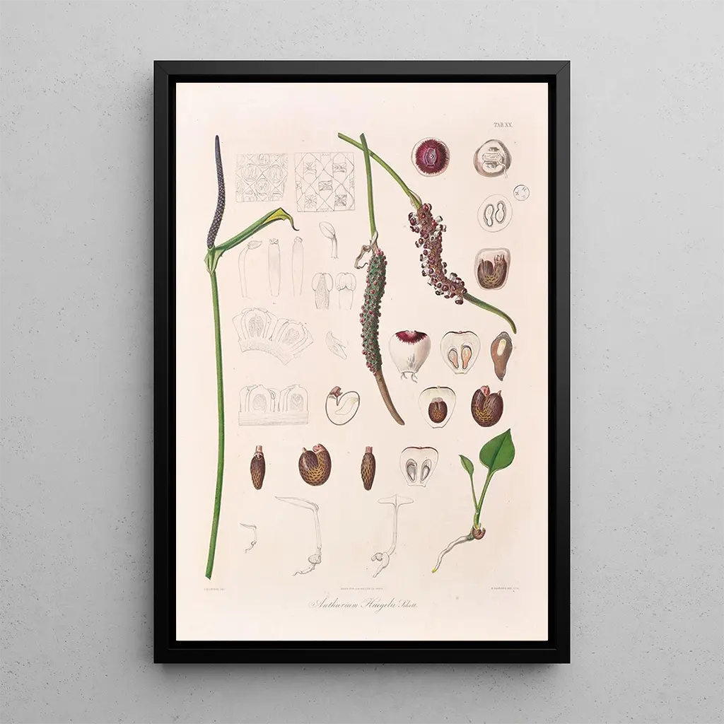 The art print of Icones Aroidearum Pl20 transports us into a lush world where plant diversity is showcased brilliantly. Every detail, from the veins of the leaves to the shades of the flowers, is meticulously rendered, demonstrating Heinrich Wilhelm Schott’s expertise. The vibrant colors and harmonious composition create a lively and dynamic atmosphere, inviting viewers to appreciate the beauty of flora. This piece, created with refined watercolor techniques, evokes a sense of lightness and delicacy, capturing the very essence of nature in all its splendor.