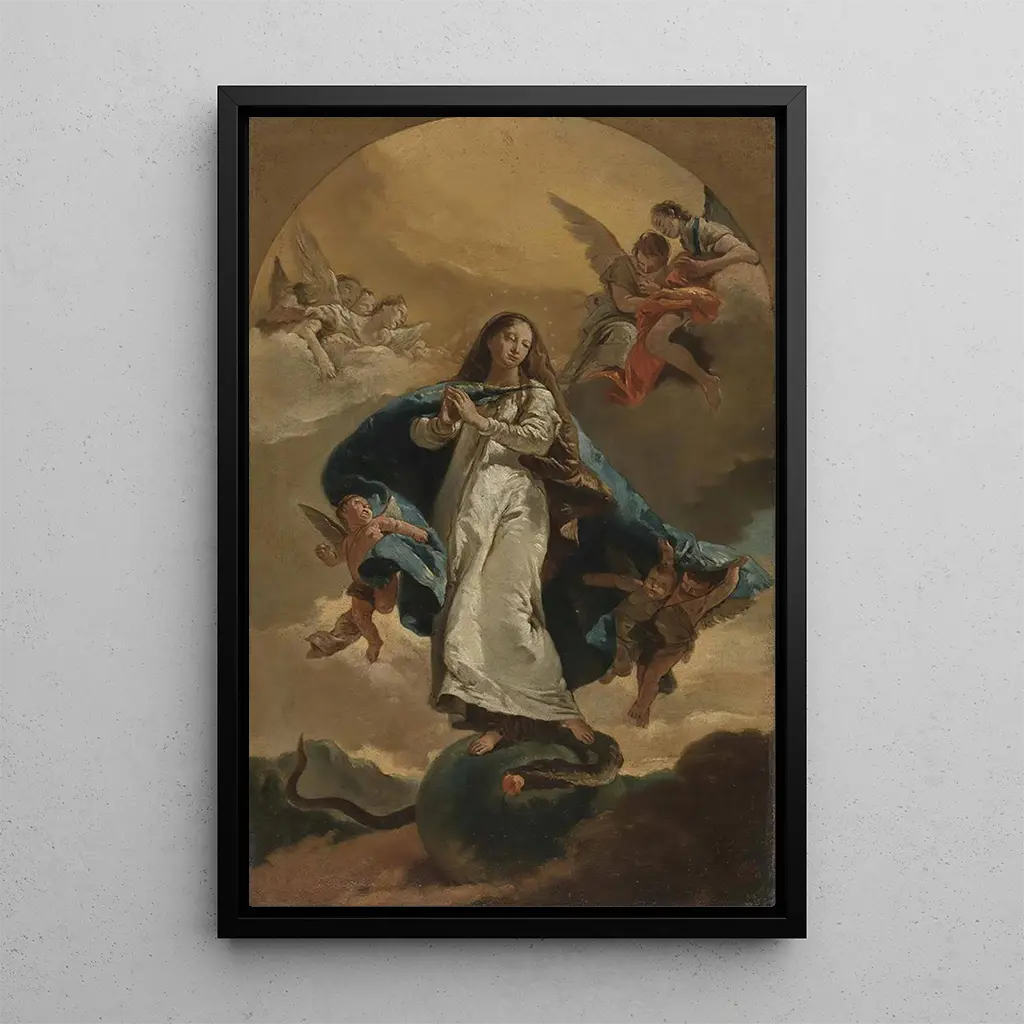 Giovanni Battista Tiepolo, born in 1696 in Venice, is recognized as one of the masters of baroque and rococo. His flamboyant style and grandiose compositions marked his era, influencing many artists. Tiepolo successfully combined tradition and innovation, integrating narrative and symbolic elements into his works. "The Immaculate Conception" is a perfect example of his talent, illustrating religious devotion while offering a poetic vision of spirituality. His legacy endures, making him a key figure in art history.