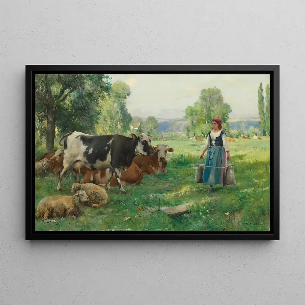 In this art print of "In a Pasture," Julien Dupré transports us to the heart of a pastoral scene imbued with tranquility. The soft hues of nature, from vibrant greens to warm browns, harmonize to create a soothing atmosphere. Dupré's impressionist technique is evident through fluid brushstrokes, capturing the light that dances across the surfaces. The animals, peacefully scattered across the landscape, add a touch of life to this canvas, inviting the viewer to immerse themselves in a moment of calm and contemplation.