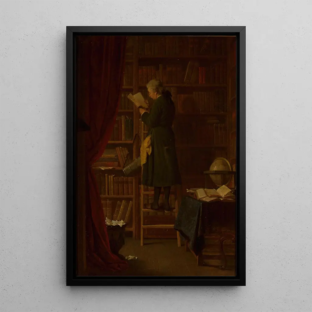 The art print "In the library" by Georg Reimer transports the viewer into a world of knowledge and contemplation. This artwork depicts an intimate scene, where books with antique bindings are arranged on wooden shelves, creating a warm and studious atmosphere. The warm colors and play of light emphasize the welcoming nature of this space, inviting reading and reflection. The carefully composed layout, with meticulous details, makes this canvas a true homage to the passion for literature and the art of the library.