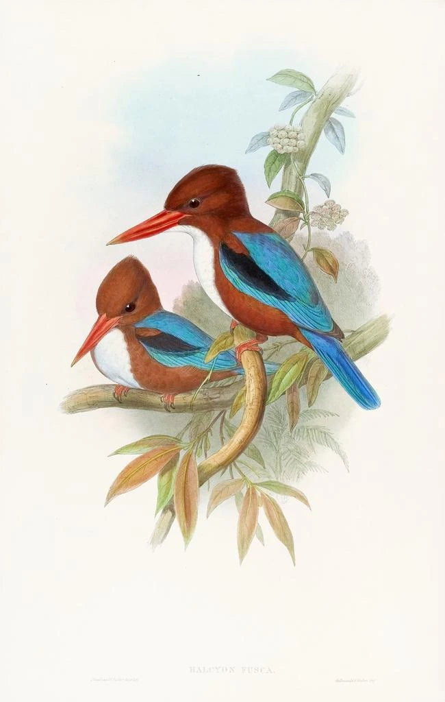 The art print of the Indian kingfisher awakens the senses with its brilliance and grace. John Gould, through his unmatched talent, manages to capture the very essence of this fascinating bird. The vivid colors, ranging from cobalt blue to fiery orange, blend to create a dynamic composition that evokes the vitality of tropical rivers. The piece exudes an atmosphere of tranquility and movement, inviting the viewer to appreciate the fleeting beauty of nature. Every detail, from the reflections on the feathers to the nuances of light, testifies to Gould's mastery in the art of ornithological illustration.