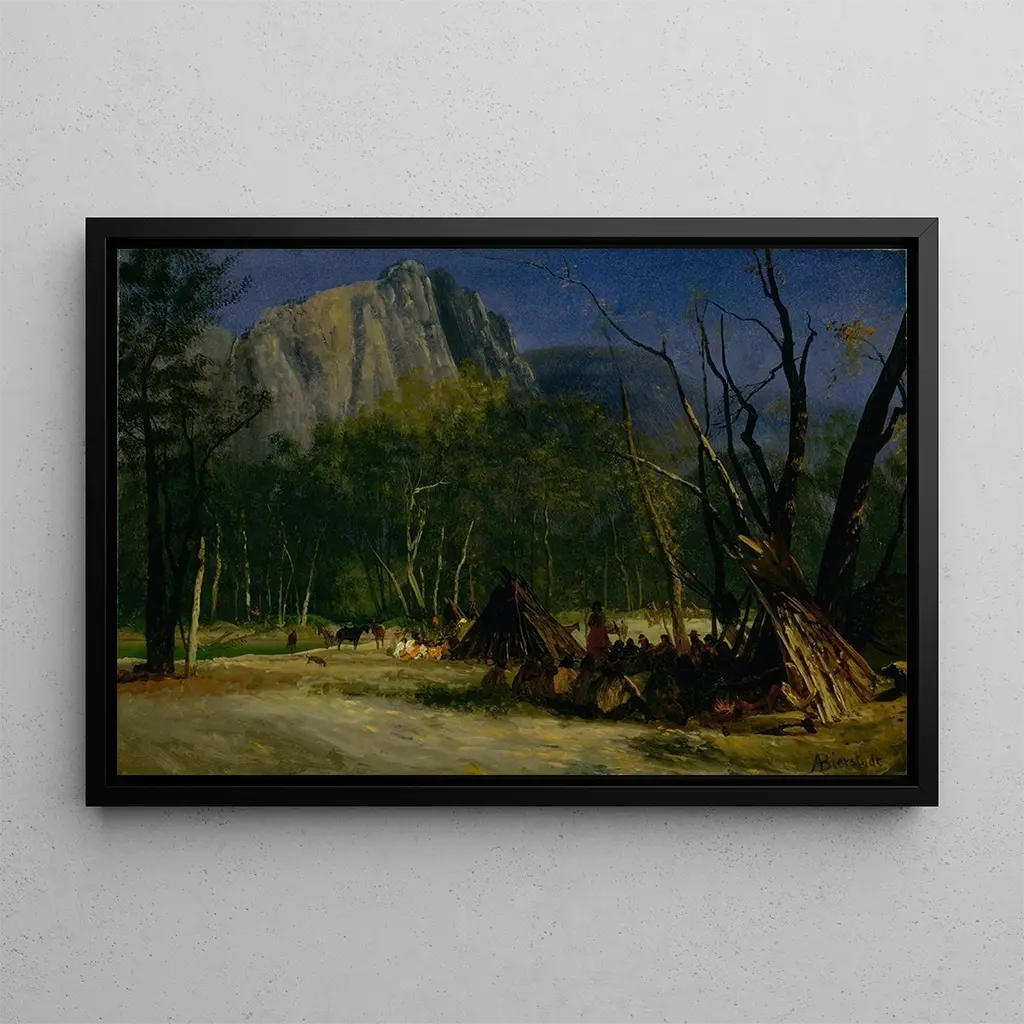 "California Indian Council" is a captivating art print that transports us to the heart of cultural exchanges among indigenous peoples. Albert Bierstadt, with his rich palette and dynamic compositions, manages to capture the intensity of human interactions. The figures, dressed in traditional costumes, are depicted in soft lighting, creating an atmosphere that is both solemn and vibrant. The art print evokes not only a moment of dialogue but also a deep connection with the land and ancestral traditions, inviting the viewer to reflect on history and cultural identity.