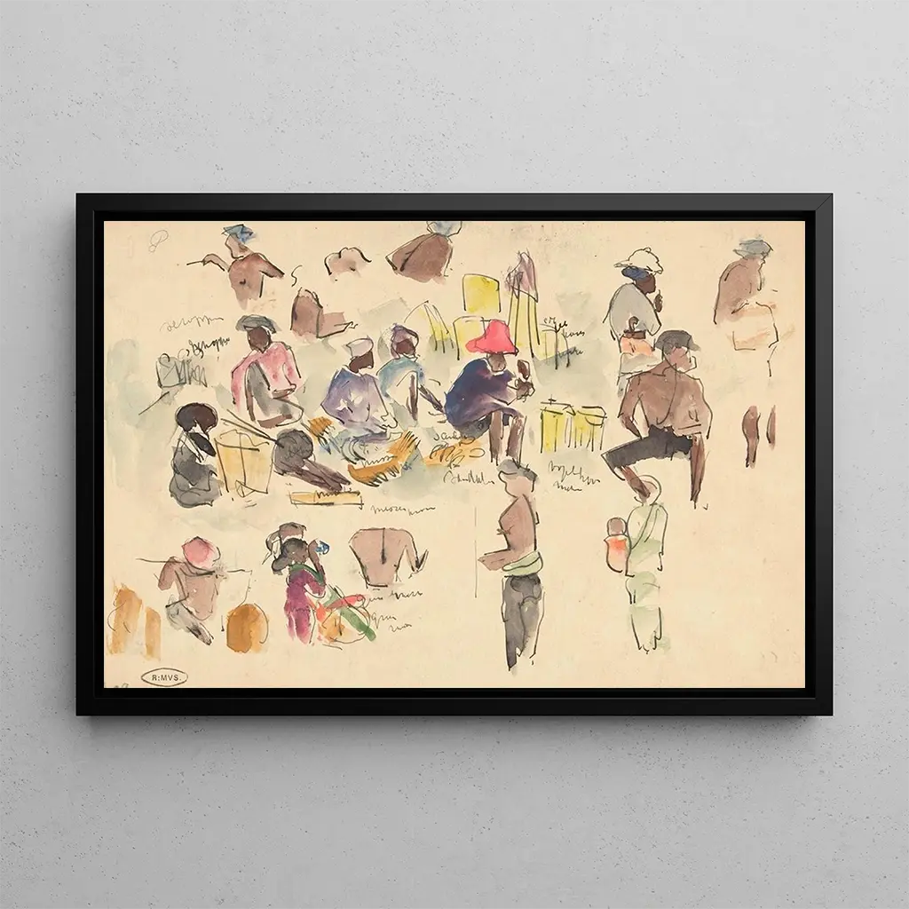 The art print "Figures Indigènes" by Pierre Jean Apol evokes a richness of colors and shapes that capture the very essence of life and traditions of indigenous peoples. The characters, dressed in traditional clothing, seem to come to life under the artist's brush, each detail revealing a unique story. The shades of earth and vegetation blend harmoniously, creating an atmosphere that is both vibrant and soothing. The piece invites the viewer to immerse themselves in a world where nature and humanity coexist in perfect symbiosis, offering a deeply immersive visual experience.