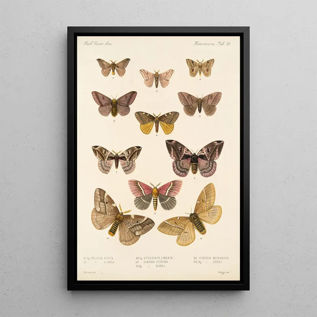 The art print Insecta Lepidoptera Heterocera Pl 020 by Frederick DuCane Godman immerses us in a fascinating universe where the delicacy of nocturnal butterflies is highlighted. The meticulous details of the wings, adorned with complex patterns, reveal a palette of subtle colors ranging from warm browns to shades of blue and green. The engraving technique used by Godman captures not only the beauty of the insects but also the mysterious atmosphere that surrounds them. Each element of this artwork seems to vibrate with its own life, inviting the viewer to explore the wonders of nature.