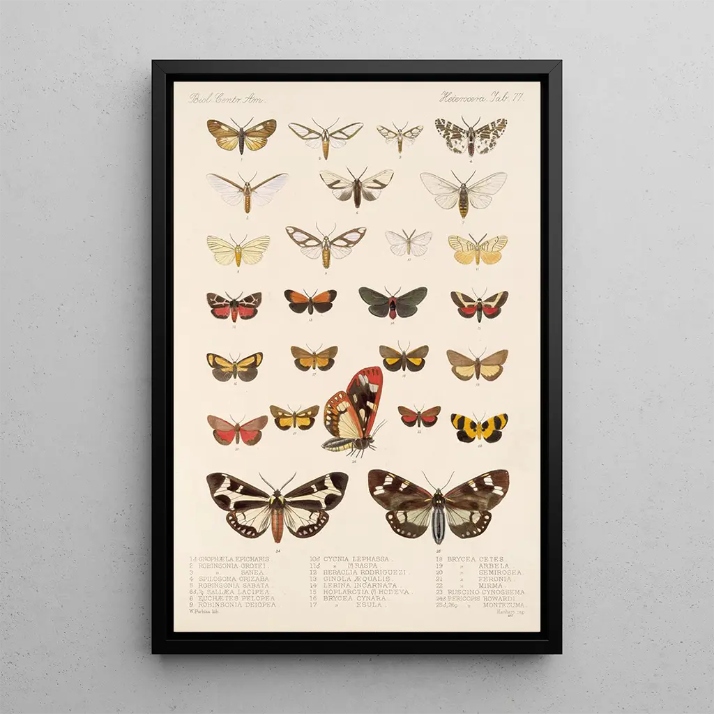 The art print Insecta Lepidoptera Heterocera Art print Pl 077 invites you to delve into a delicate and colorful world. This piece, created with remarkable precision, highlights nocturnal butterflies, capturing the diversity of shapes and shades. The vibrant colors, ranging from bright hues to darker nuances, create an atmosphere that is both lively and mysterious. The naturalist illustration technique pays tribute to the beauty of nature while offering a detailed and scientific view of these fascinating insects.