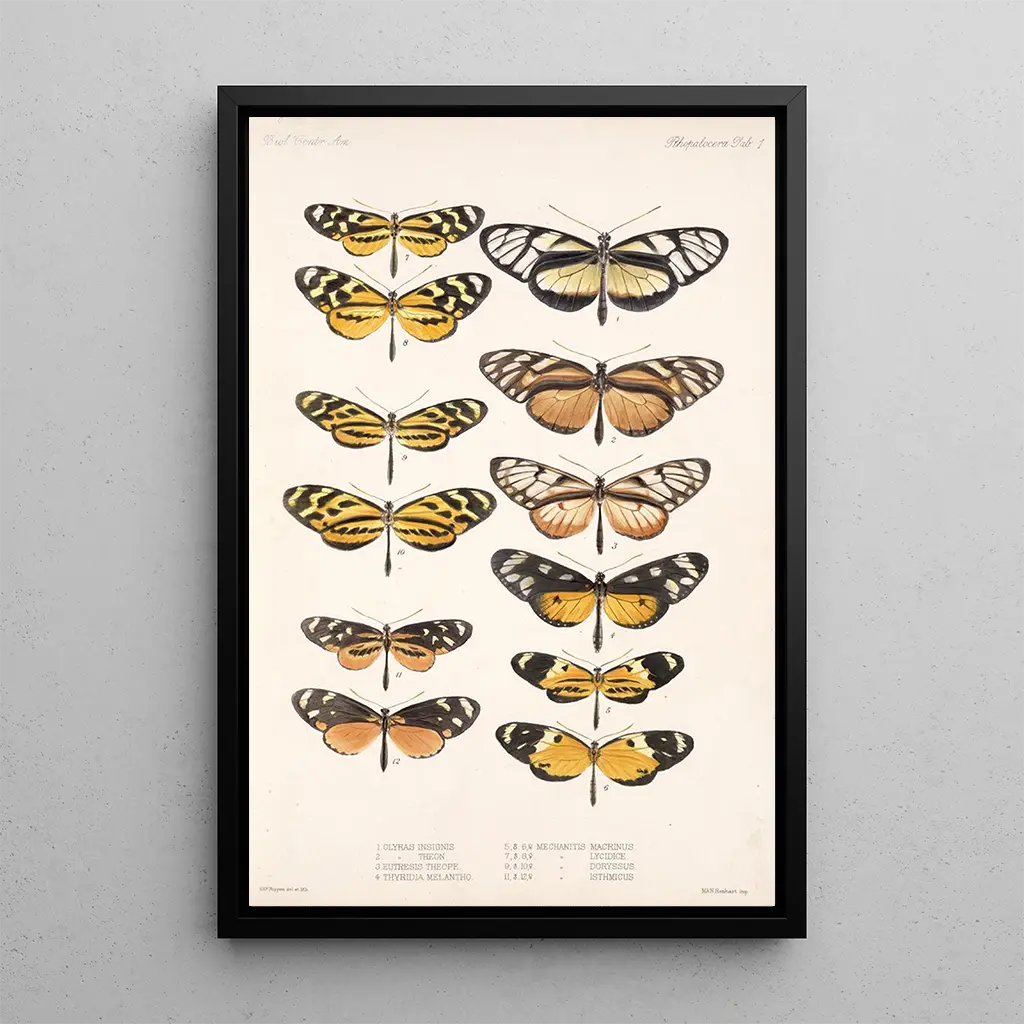 "Insecta Lepidoptera Rhopalocera Pl 001" by Frederick DuCane Godman is an art print that captures the very essence of butterflies. With meticulous attention to detail, this reproduction highlights the diversity of species through vibrant colors and delicate patterns. The watercolor technique used by Godman brings each insect to life, creating a light and airy atmosphere. The shades of color, ranging from soft pastels to brighter hues, evoke the fragility and ephemeral beauty of these creatures. This canvas invites contemplation and wonder at nature.