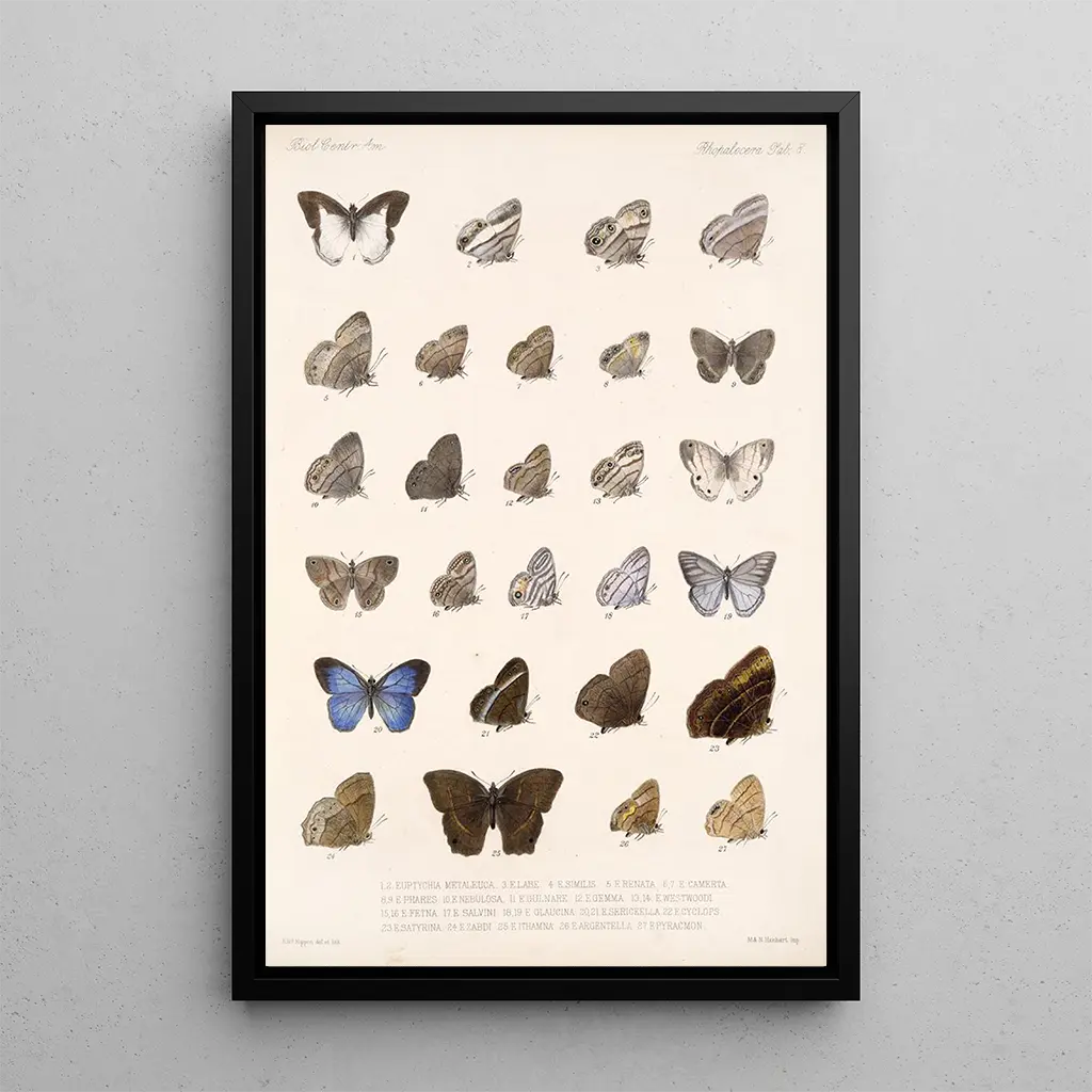The art print Insecta Lepidoptera Rhopalocera Pl 008 is a true ode to the delicacy of butterflies. With its vibrant colors and meticulous details, this piece immediately captures the eye. The shades of blue, yellow, and orange blend harmoniously, creating a lively and joyful atmosphere. The engraving technique used by the artist allows each wing to be rendered with remarkable precision, highlighting the unique patterns that adorn these fascinating insects. This canvas invites attentive contemplation, revealing the ephemeral beauty of nature.