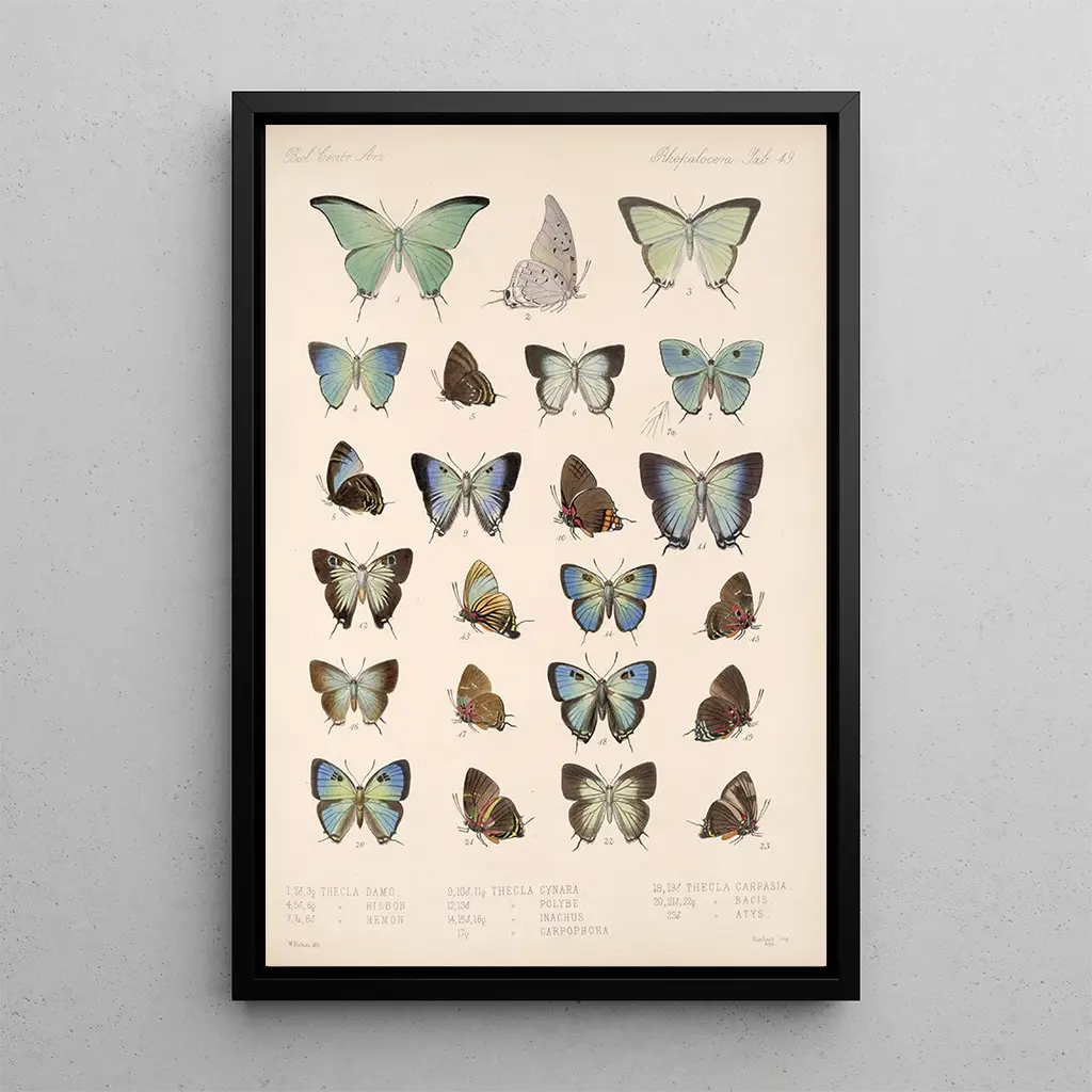 The art print "Insecta Lepidoptera Rhopalocera Pl 050" by Frederick DuCane Godman immerses us in a fascinating universe where nature expresses itself with grace. This reproduction highlights a multitude of butterflies, each illustrated with remarkable precision. The bright and varied colors, ranging from vibrant blues to luminous yellows, create a joyful and lively atmosphere. The watercolor technique, used with finesse, captures the lightness and ephemeral beauty of these insects. Gazing at this canvas, one feels invited to explore the natural world and marvel at the diversity of species.