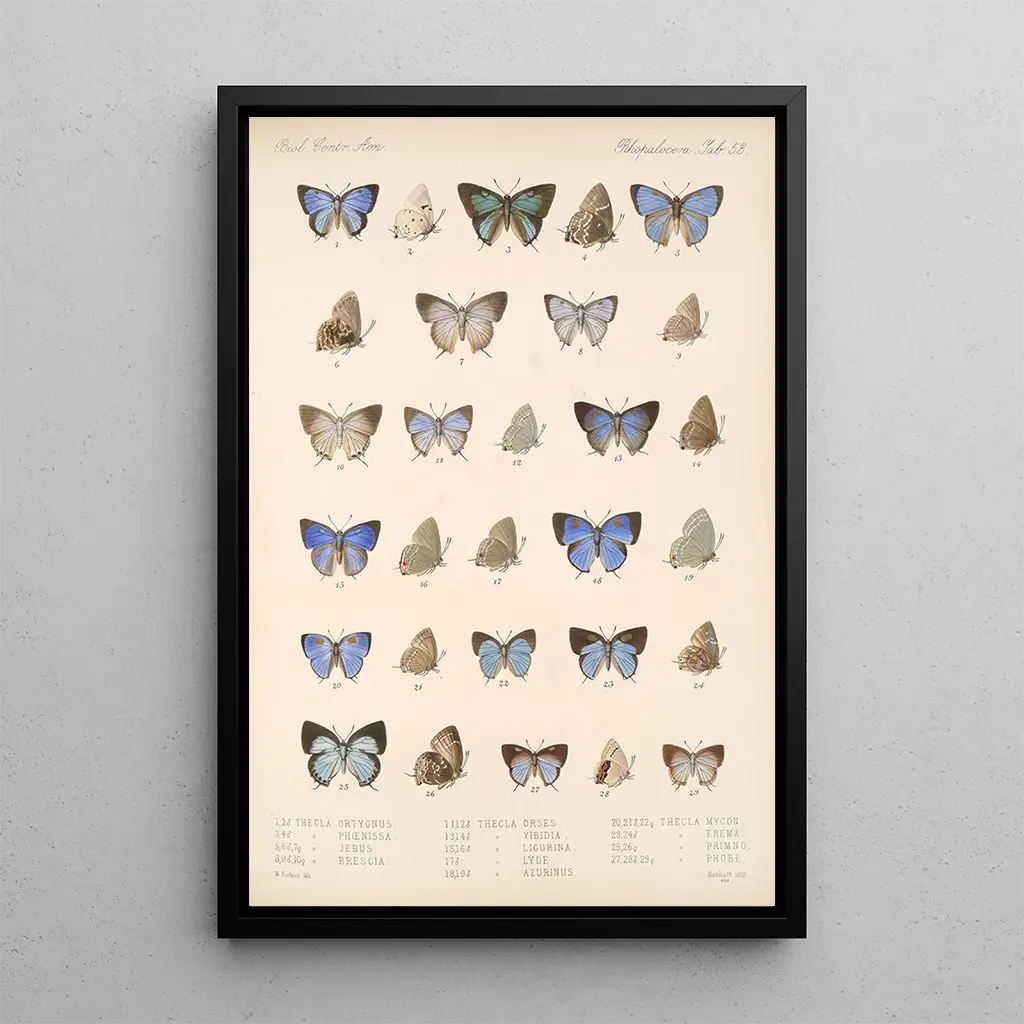 The art print of Insecta Lepidoptera Rhopalocera Pl 054 immerses us in a fascinating universe where vibrant colors and intricate details of butterflies intertwine. This piece, created with a delicate engraving technique, highlights the ephemeral beauty of these insects. The shades of blue, yellow, and orange blend harmoniously, creating an atmosphere that is both joyful and soothing. The artist manages to capture the gentle movement of the wings, evoking a sense of lightness and freedom, as if these creatures come to life before our eyes.
