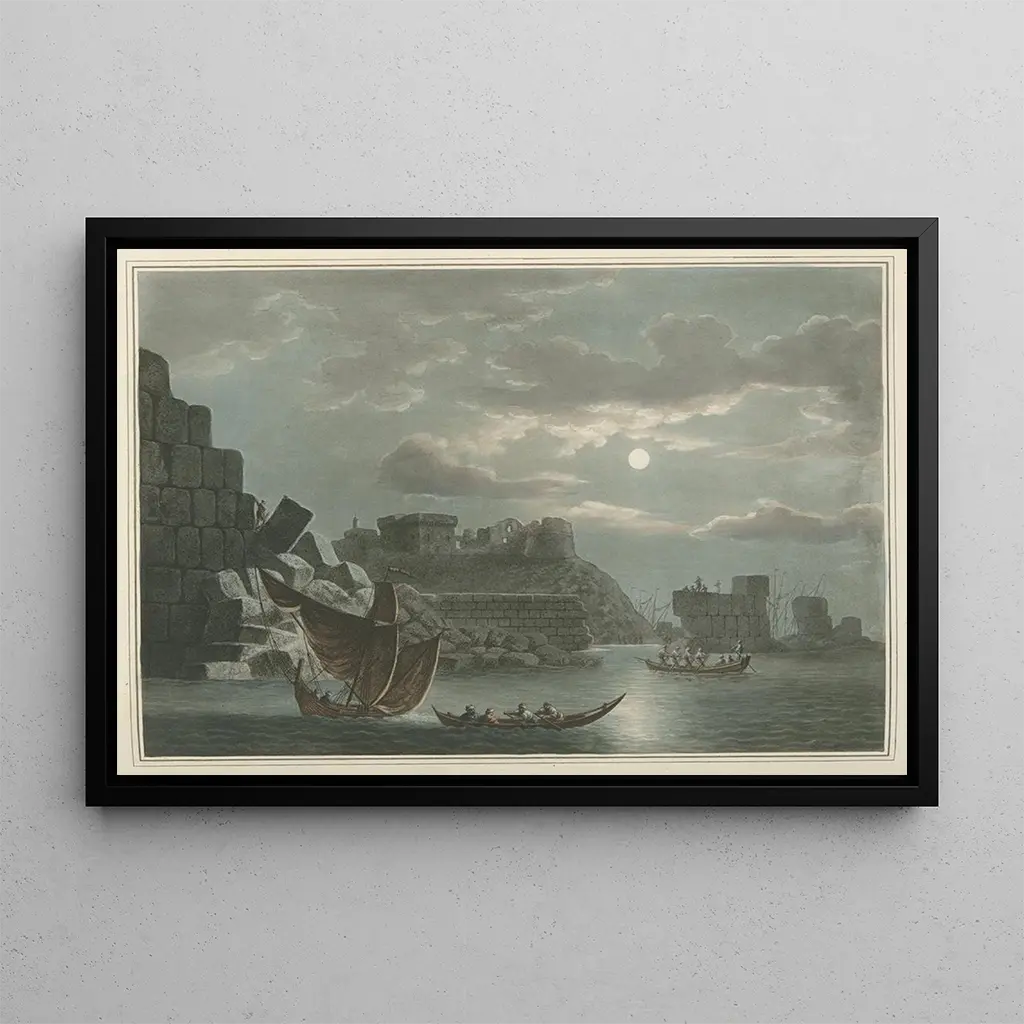 The Island of Tortosa, an iconic work by Luigi Mayer, transports the viewer to an enchanting landscape where nature and architecture meet harmoniously. The soft shades of blue and green dominate the canvas, creating a soothing atmosphere. The oil painting technique allows for detailed rendering of buildings and trees with great precision, while light plays a crucial role, illuminating the elements of the scene and adding an almost lifelike dimension. This art print invites contemplation, offering a glimpse into a world where time seems to stand still.