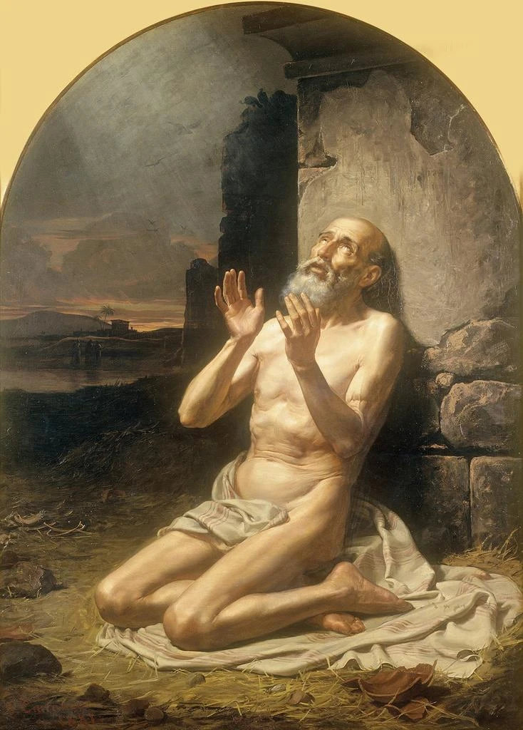 Dans cette œuvre poignante, Gonzalo Carrasco dépeint Job, personnage biblique emblématique, assis sur un tas de fumier, symbole de souffrance et de résilience. Les couleurs terreuses et sombres dominent la toile, créant une atmosphère de désespoir mêlée à une lueur d'espoir. La technique de Carrasco, qui allie réalisme et expressionnisme, permet de ressentir l'intensité des émotions de Job. Les détails minutieux des expressions faciales et des textures renforcent l'impact visuel, plongeant le spectateur dans la profondeur de la douleur humaine et de la foi inébranlable.