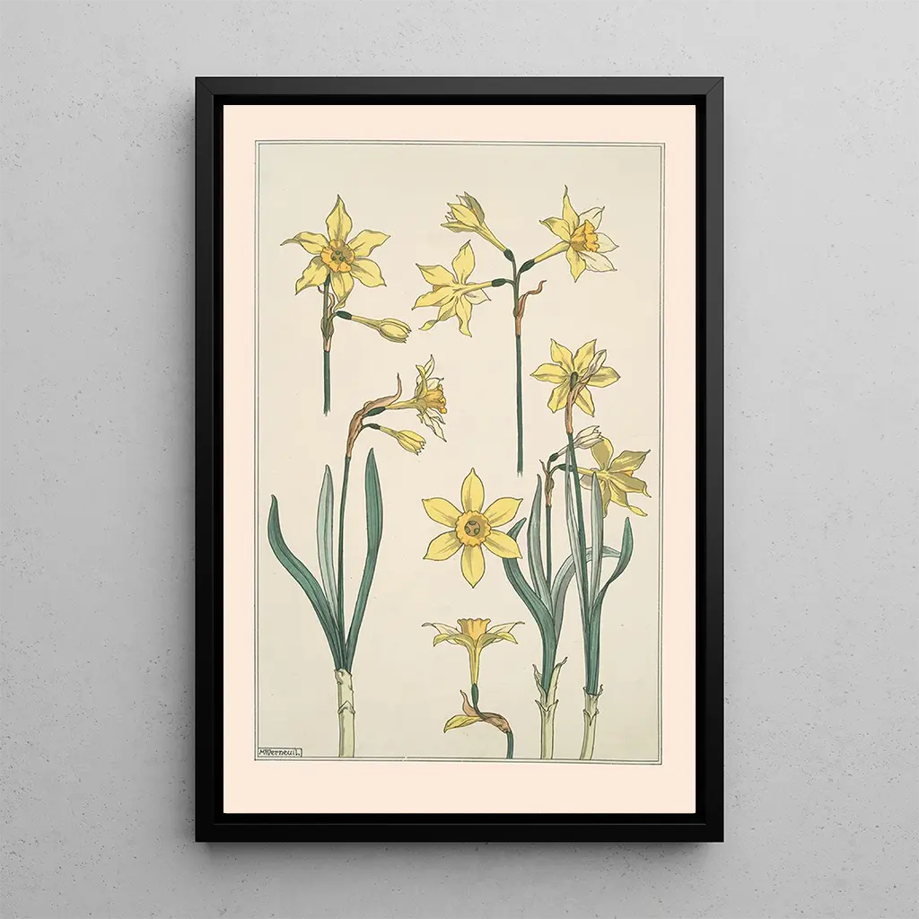 Jonquille: an explosion of light and color The art print Jonquille by Maurice Pillard Verneuil is a vibrant work that captures the very essence of spring. The yellow flowers, bursting with life, seem to dance under the light, while the shades of green and blue in the background evoke a lush garden. The artist's technique, which combines watercolor and oil, creates a soft and dreamy atmosphere, inviting the viewer to immerse themselves in a world of natural beauty. Each petal is delicately detailed, and the harmonious composition draws the eye, offering a soothing and joyful visual experience. Maurice Pillard Verneuil: a master of the Art Nouveau movement Maurice Pillard Verneuil, active at the end of the 19th and beginning of the 20th century, is an emblematic representative of Art Nouveau. Influenced by nature and organic shapes, his work is distinguished by floral motifs and sinuous lines. Verneuil was able to capture the spirit of his era, where art intertwined with craftsmanship, and he helped popularize decorative aesthetics. His innovative approach left a lasting impression, and his works continue to inspire contemporary artists. The art print Jonquille testifies to his exceptional talent and his commitment to natural beauty. A decorative acquisition with multiple assets The art print of the painting Jonquille is an ideal choice to enhance your interior, whether in a living room, office, or bedroom. Its bright and cheerful palette brings a touch of freshness and vitality to any space. The quality of the print guarantees remarkable fidelity to the colors and details of the original work, allowing you to fully enjoy Verneuil's art. By choosing this canvas, you add not only a decorative piece but also a conversation starter that evokes the elegance and beauty of Art Nouveau.