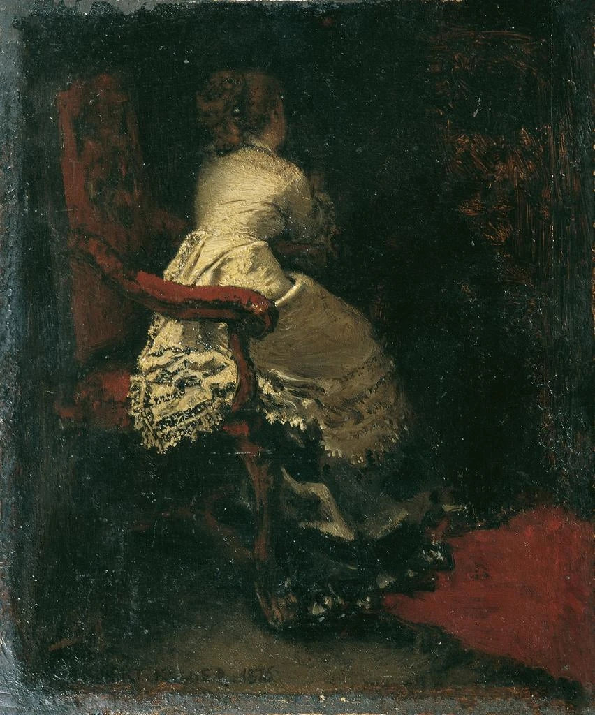 Albert von Keller's style is distinguished by a realistic approach and a particular sensitivity to human emotions. In Dame dans un fauteuil, the choice of warm colors and delicate shadows gives the piece an almost tangible atmosphere. The woman's posture, both relaxed and pensive, reveals deep introspection, while the richly decorated armchair evokes comfort and elegance. Keller excels in rendering textures, whether through the fabric of the clothing or the softness of the hair, creating a visual harmony that captivates the eye. The subtly modulated light plays a vital role, illuminating the lady's face and emphasizing the intensity of her gaze, thus inviting the viewer to ponder her thoughts.