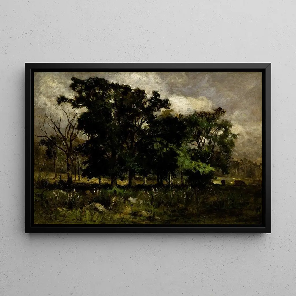 In this captivating artwork, Edward Mitchell Bannister transports us to the heart of an enchanting landscape, where light plays with the foliage of the trees. The vibrant colors and delicate shades of green and brown create a peaceful, almost meditative atmosphere. Bannister's technique, blending impressionism and realism, allows us to feel the texture of the bark and the softness of the leaves. Each brushstroke seems to invite the viewer to immerse themselves in this bucolic scene, where time appears to stand still, offering a true sensory escape.