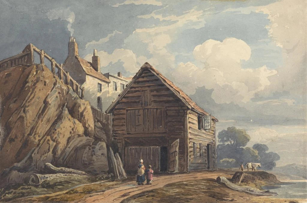 Paysage avec un hangar à bateaux: a maritime tranquility scene