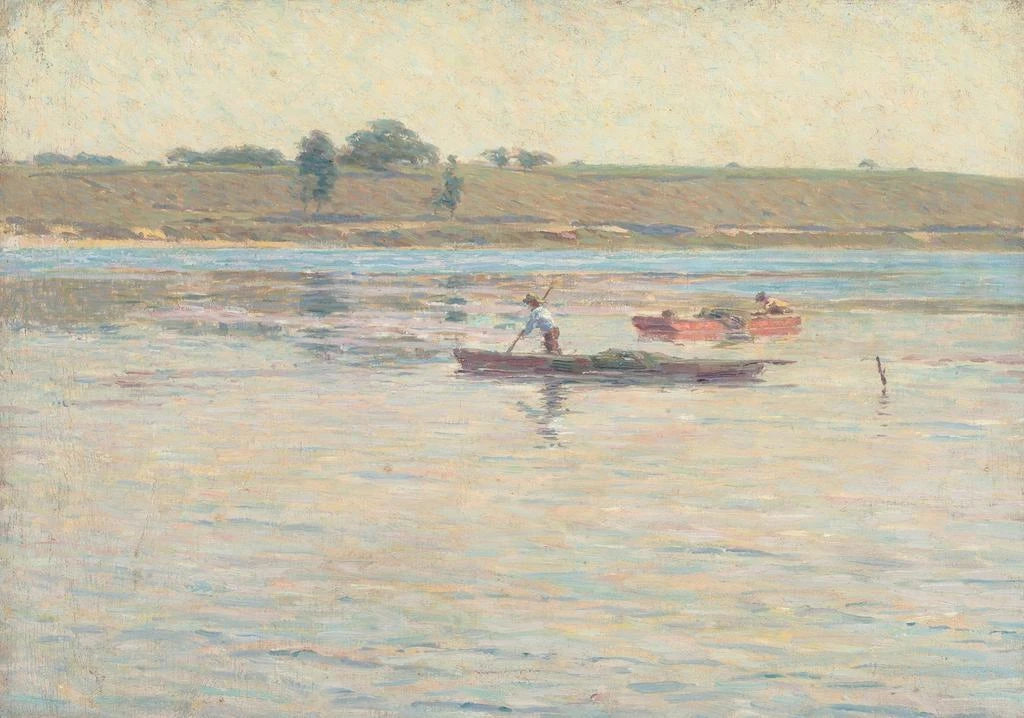 The artwork "Landscape with Fishermen" is a captivating piece that illustrates the peaceful coexistence between humans and their environment. In this bucolic scene, fishermen are busy by the edge of a watercourse, while the surrounding nature flourishes in vibrant colors. The soft tones of the canvas, blending lush greens and soothing blues, create a serene and contemplative atmosphere. The technique used, characterized by fluid brushstrokes, gives an impression of movement, as if one could hear the murmur of the water and the singing of birds. This art print invites an escape to idyllic landscapes, far from daily turmoil.