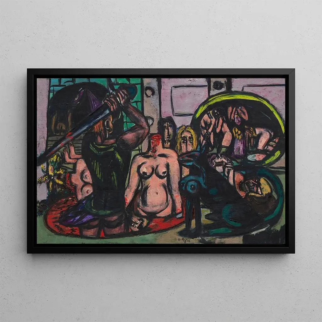 The art print of Last Duty of Perseus by Max Beckmann transports us into a world filled with emotion and symbolism. This piece, with its vivid colors and expressive forms, illustrates the tragic moment when Perseus prepares to fulfill his destiny. The complex composition, blending human figures and mythological elements, creates an atmosphere that is both dark and captivating. Beckmann, through his unique style, manages to convey the dramatic tension of the scene, inviting the viewer to feel the weight of the fate resting on the hero.