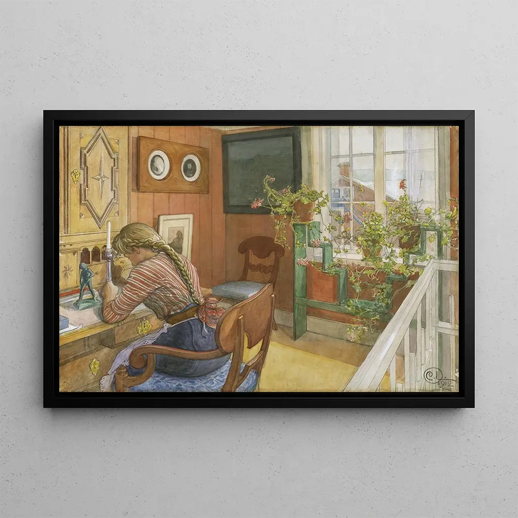 In this delicate art print, Carl Larsson captures a moment of tenderness and reflection. The composition highlights a woman, probably a mother, writing letters, surrounded by a warm and luminous interior. The soft, pastel colors, typical of the artist, create a peaceful and intimate atmosphere. The natural light entering through the window emphasizes the meticulous details of the furniture and objects, inviting the viewer to immerse themselves in this scene of life. Each element seems to tell a story, and one can almost smell the paper and ink.
