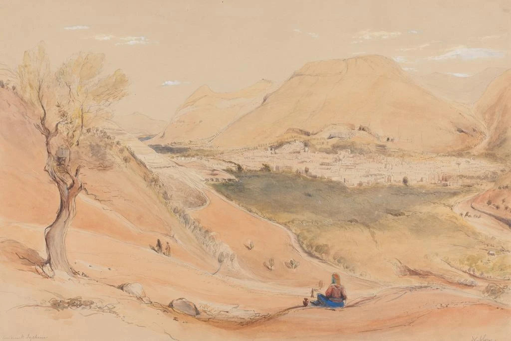 The art print of Naplouse Naplouse Jordan, created by Reverend Edward Thomas Daniell, transports us to an enchanting landscape, where rolling hills and traditional buildings blend harmoniously. The warm terracotta colors and the shades of green from the olive trees create a serene and welcoming atmosphere. The watercolor technique used by Daniell captures the sunlight caressing the scenery, adding an almost ethereal dimension to this work. Each brushstroke seems to tell a story, inviting the viewer to explore the alleys of this historic city.