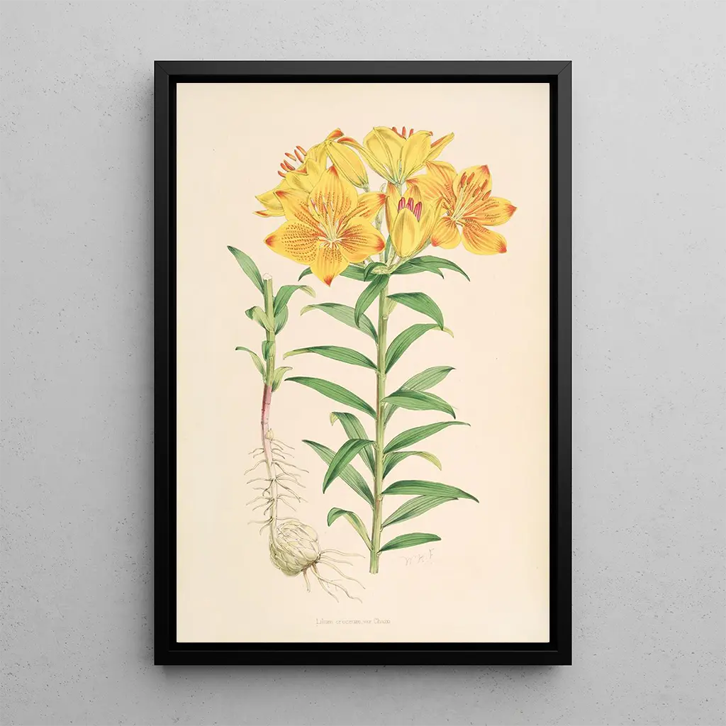 Lilium Croceum : a celebration of light and color Lilium Croceum, an iconic art print by Walter Hood Fitch, evokes the splendor of this rare flower through a luminous and warm palette. The shades of yellow and orange intertwine harmoniously, creating a vibrant and joyful atmosphere. Fitch's technical mastery is evident in the precision of the details, with each petal appearing almost alive. This art print invites attentive contemplation, revealing the ephemeral beauty of nature while celebrating floral diversity. Walter Hood Fitch : a master of botanical art Walter Hood Fitch, born in 1817, is recognized as one of the greatest botanical illustrators of his time. His career was marked by a passion for nature and a commitment to science, leading him to collaborate with renowned botanists. Fitch successfully combined art and science, paying homage to the beauty of plants while providing precise and informative illustrations. His work has had a lasting impact on botanical illustration, making him an essential figure in this discipline. A decorative acquisition with multiple assets The reproduction of Lilium Croceum is a valuable addition to any art collection, bringing a touch of color and vitality to your space. Whether in an office, a living room, or a bedroom, this canvas will captivate attention and inspire admiration. Its printing quality guarantees remarkable fidelity to the details of the original artwork, making this piece an ideal choice for botanical and art enthusiasts. Treat yourself to this art print to brighten your interior and celebrate the beauty of nature.