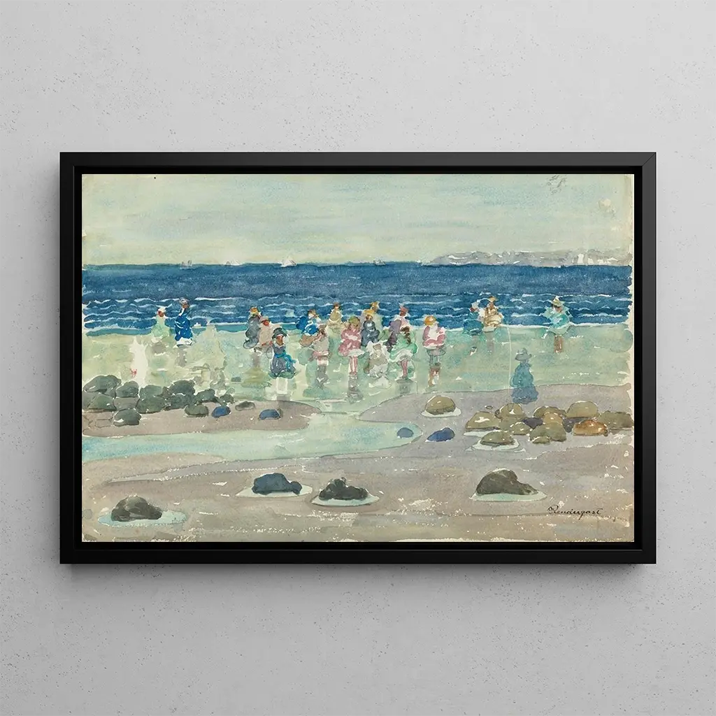The art print Low Tide by Maurice Prendergast is a vibrant piece that captures the fleeting beauty of a seaside landscape. The bright colors, ranging from deep blues to golden yellows, create a joyful and luminous atmosphere. The watercolor technique, used with mastery, brings to life the figures moving along the beach, evoking a sense of movement and lightness. Each brushstroke seems to tell a story, an invitation to immerse oneself in this suspended moment between sky and sea.